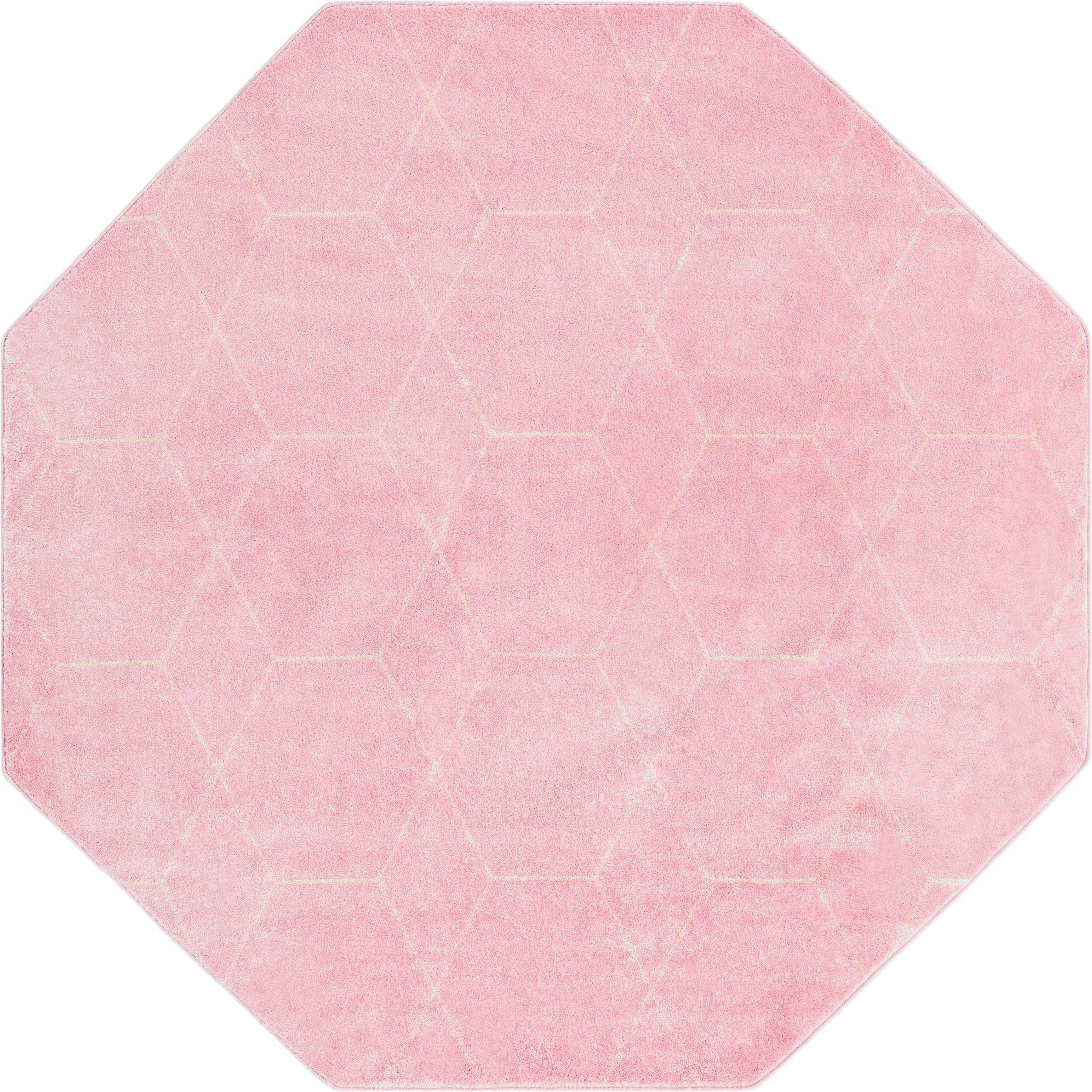 A soft light-pink field is cross-hatched with a subtle ivory hexagonal lattice, giving this octagonal rug a clean, modern geometric look with gentle visual depth. The pattern is low-relief, with the ivory lines slightly carved against the smooth cut pile so the design is noticeable without overpowering a room. Machine made from 100% polypropylene, the surface has a velvety hand and a low, dense pile that feels comfortable underfoot and shows a soft sheen when it catches the light.