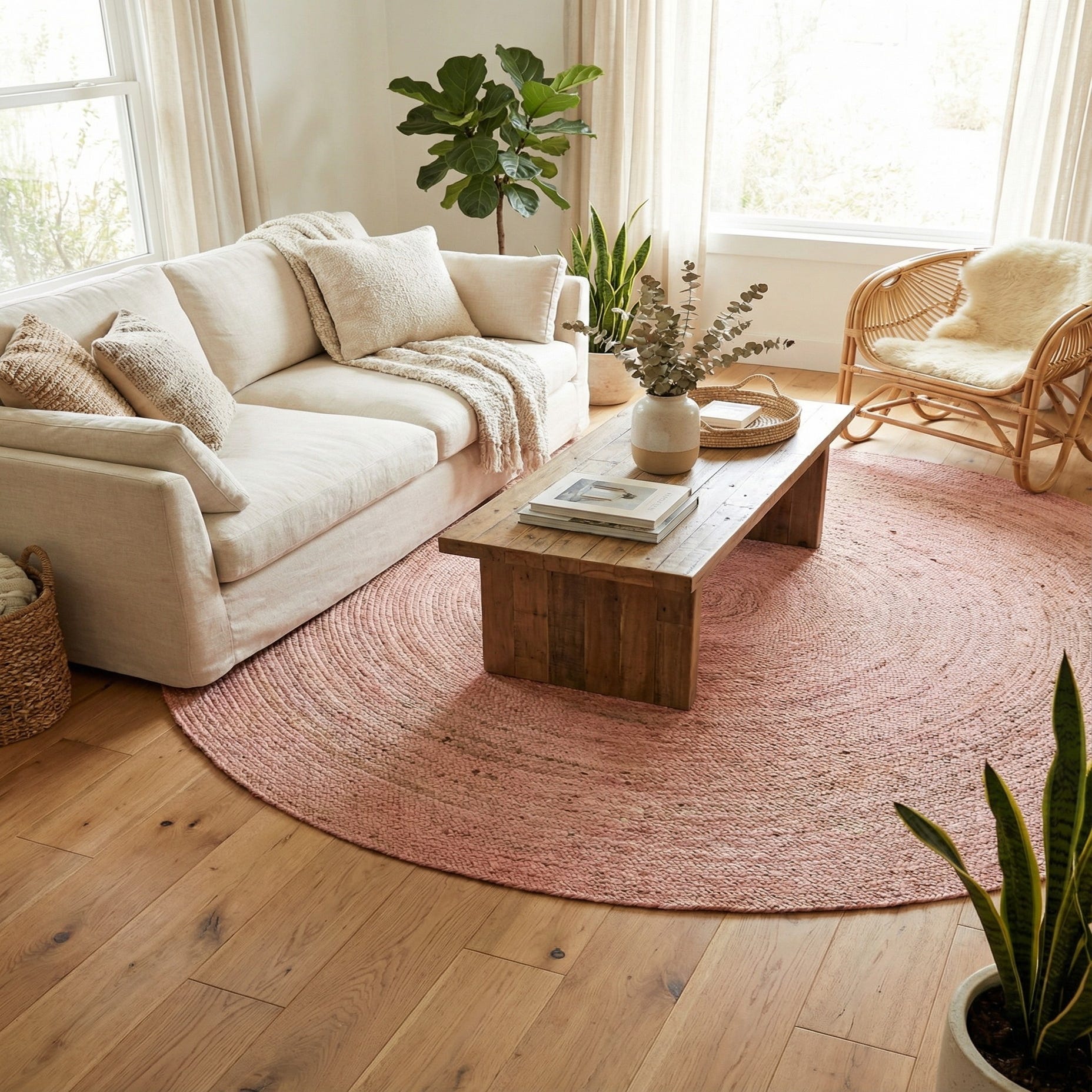 Pair it with rattan or light wood furniture, linen upholstery, and woven accents for a coastal or boho vibe, or use it to soften a modern farmhouse living room with white-painted walls and muted pastels. It also works well layered beneath a round dining table, under a cozy reading chair in a bedroom or nursery, or in a sunroom where the warm pink tone complements plants and sun-washed décor.