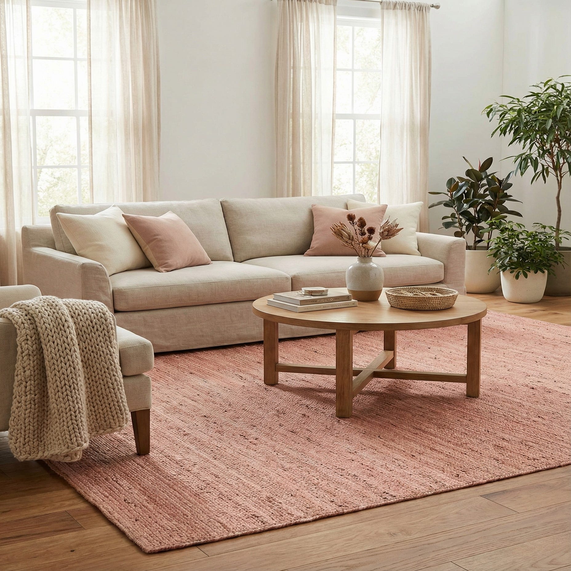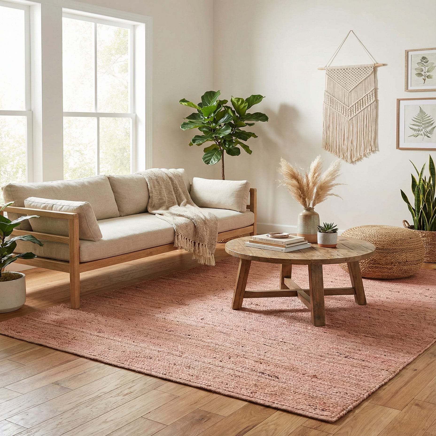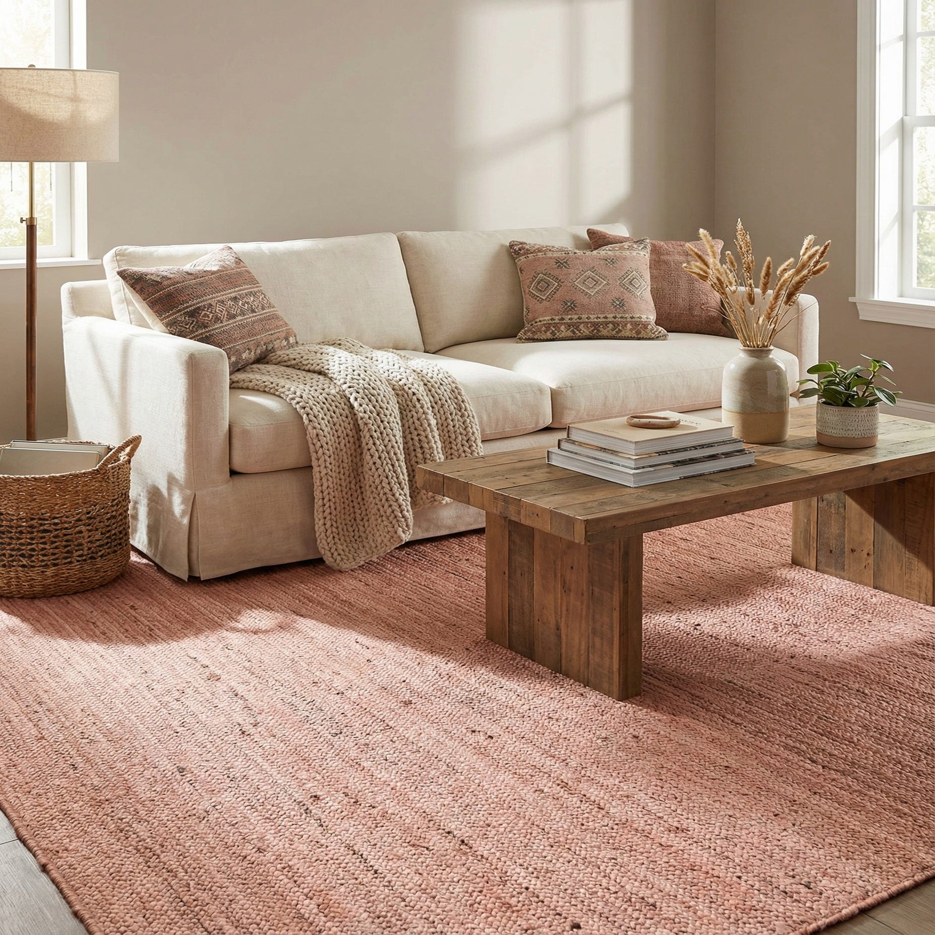 An 8x10 rectangular pink braided jute rug with a textured, flatweave surface, ideal for a living room.