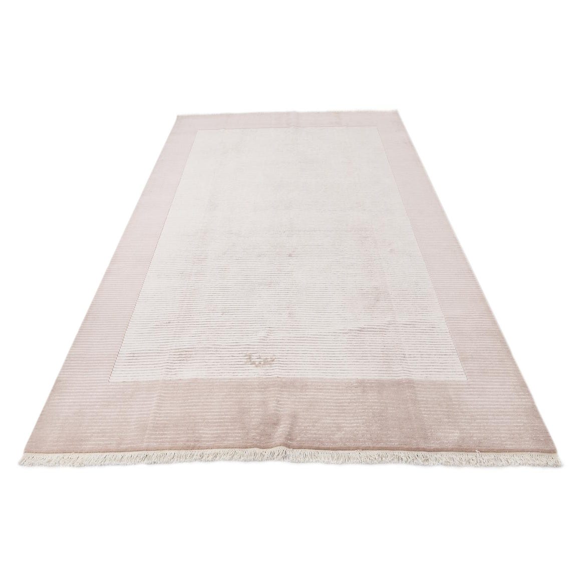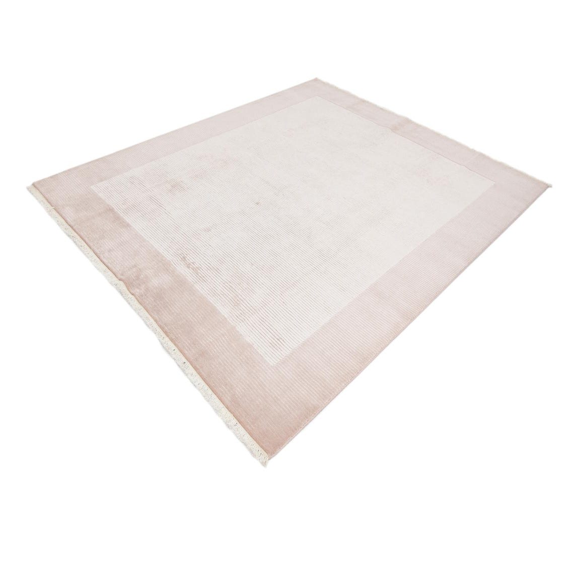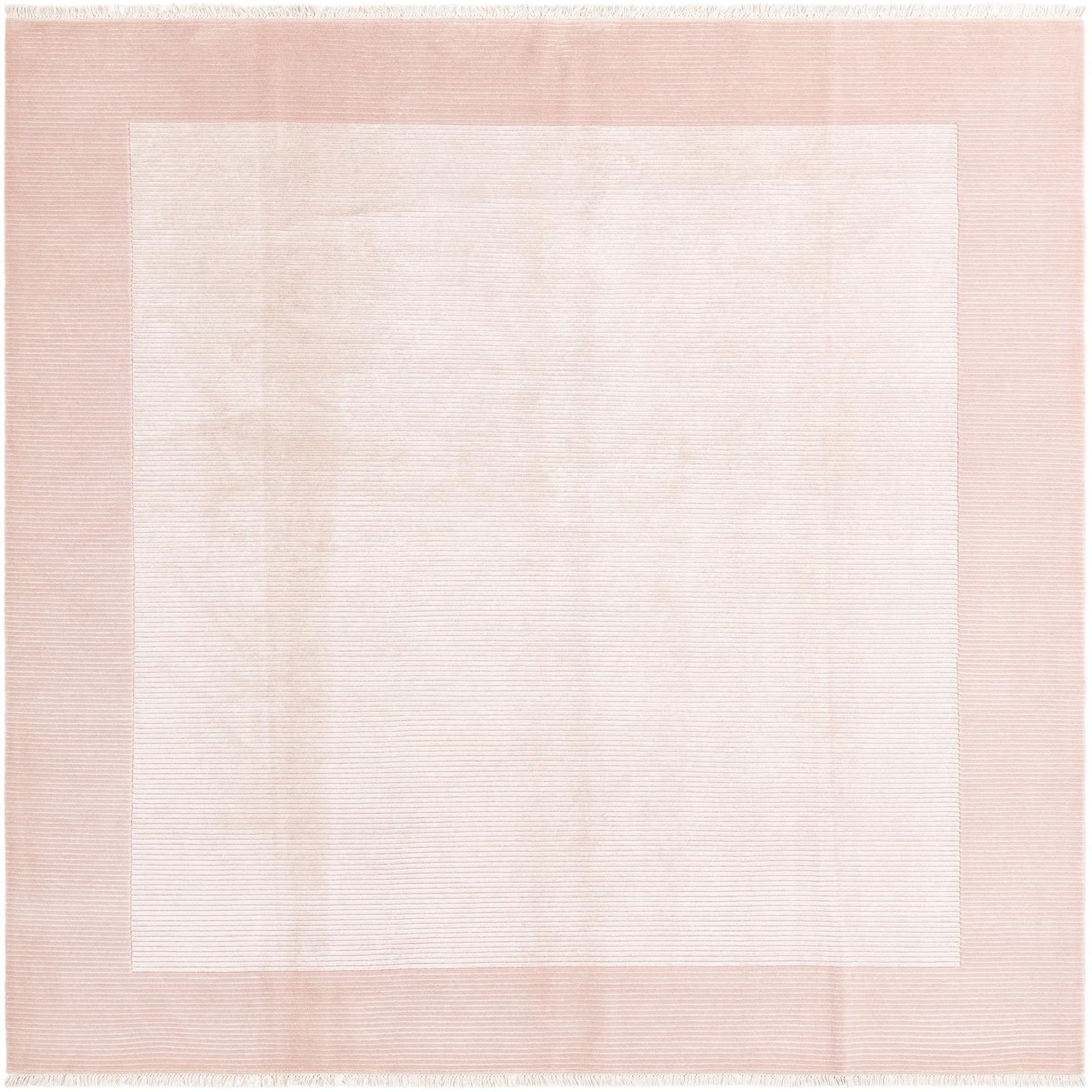 A soft pink 8x10 rectangular wool rug with a subtle border pattern, perfect for a modern living room.