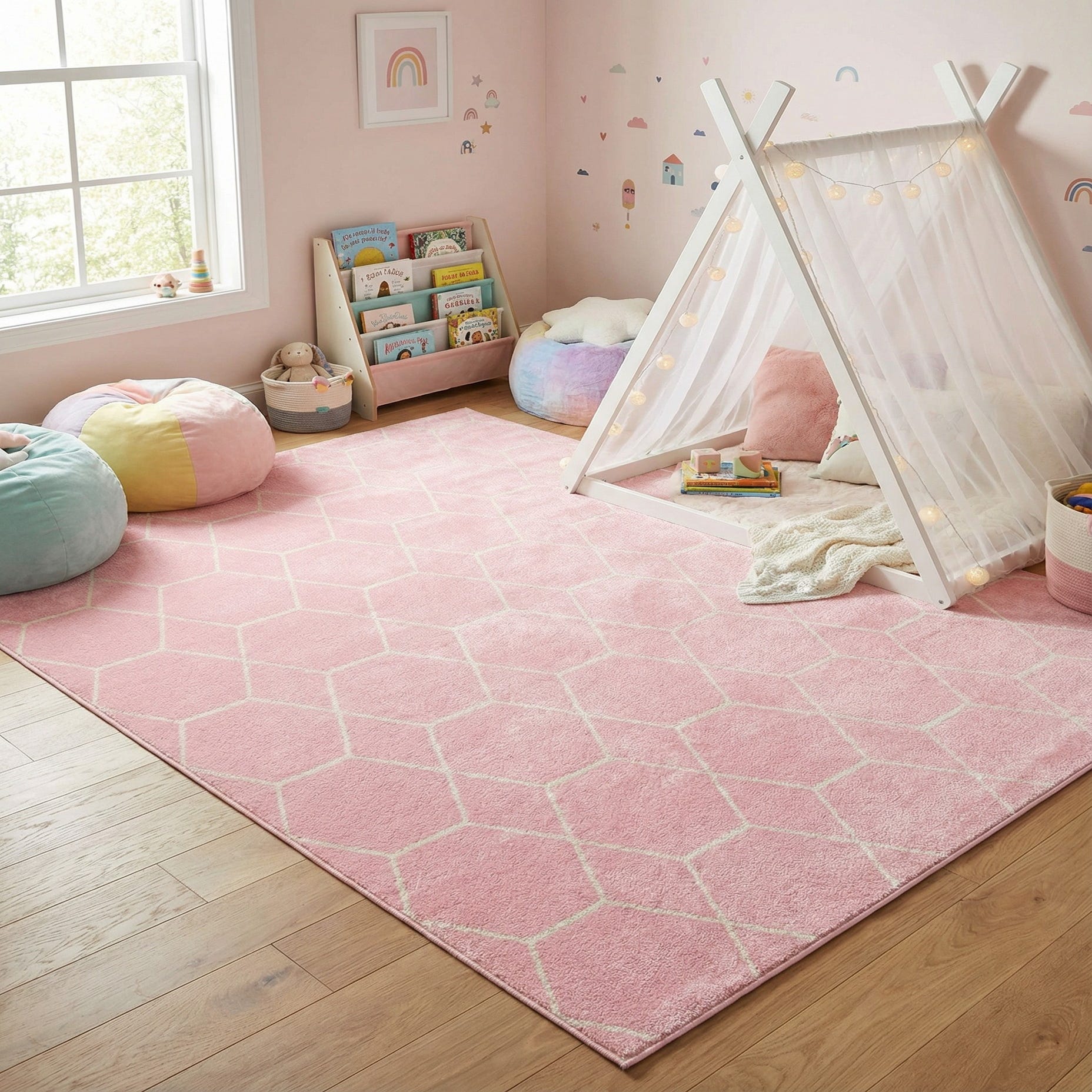 A soft light pink field is laid out in a clean hexagonal lattice, the ivory lines forming a subtle honeycomb pattern that gives the surface a modern, geometric rhythm. The cut-pile top feels soft underfoot with a low, even profile, and the slightly raised ivory lines add a gentle tactile contrast you can both see and feel. Machine-made from 100% polypropylene, the construction delivers a consistent texture and a muted, low-sheen finish.