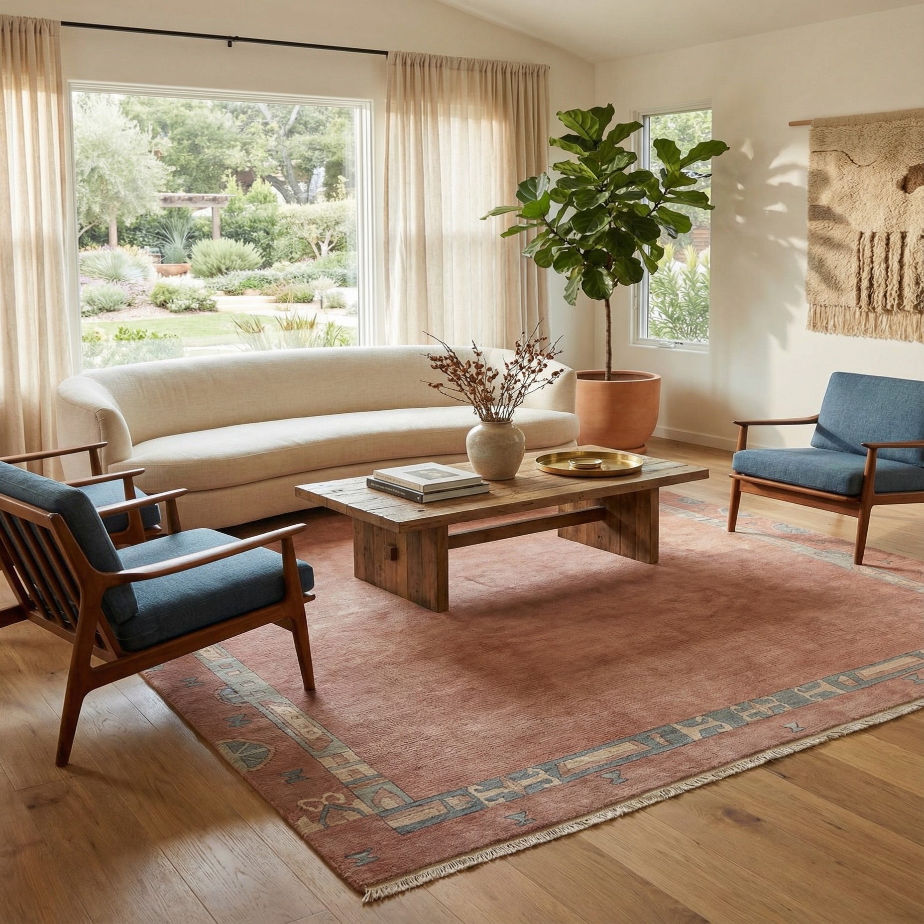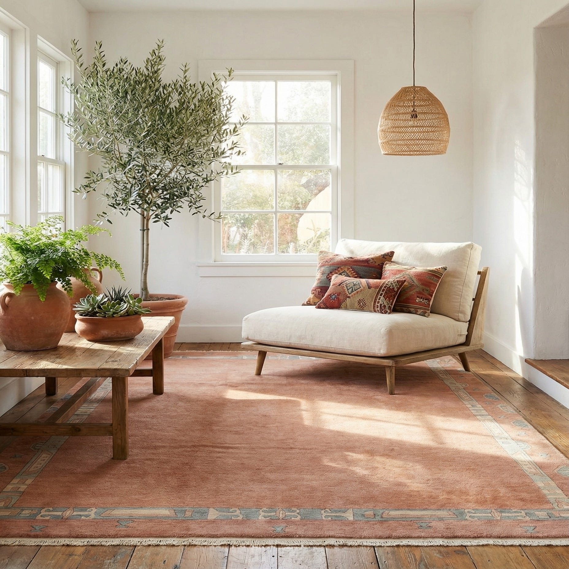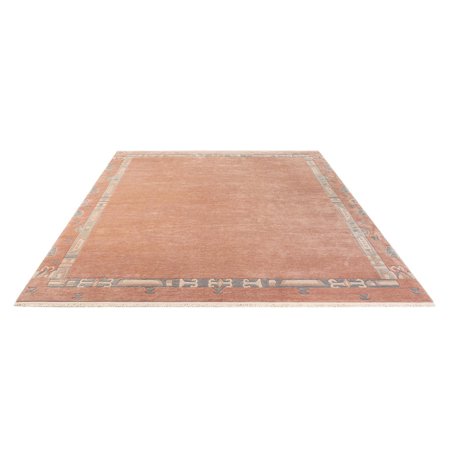 A rectangular 8x11 pink wool rug with a modern oriental border in shades of blue and beige, suitable for a living room.