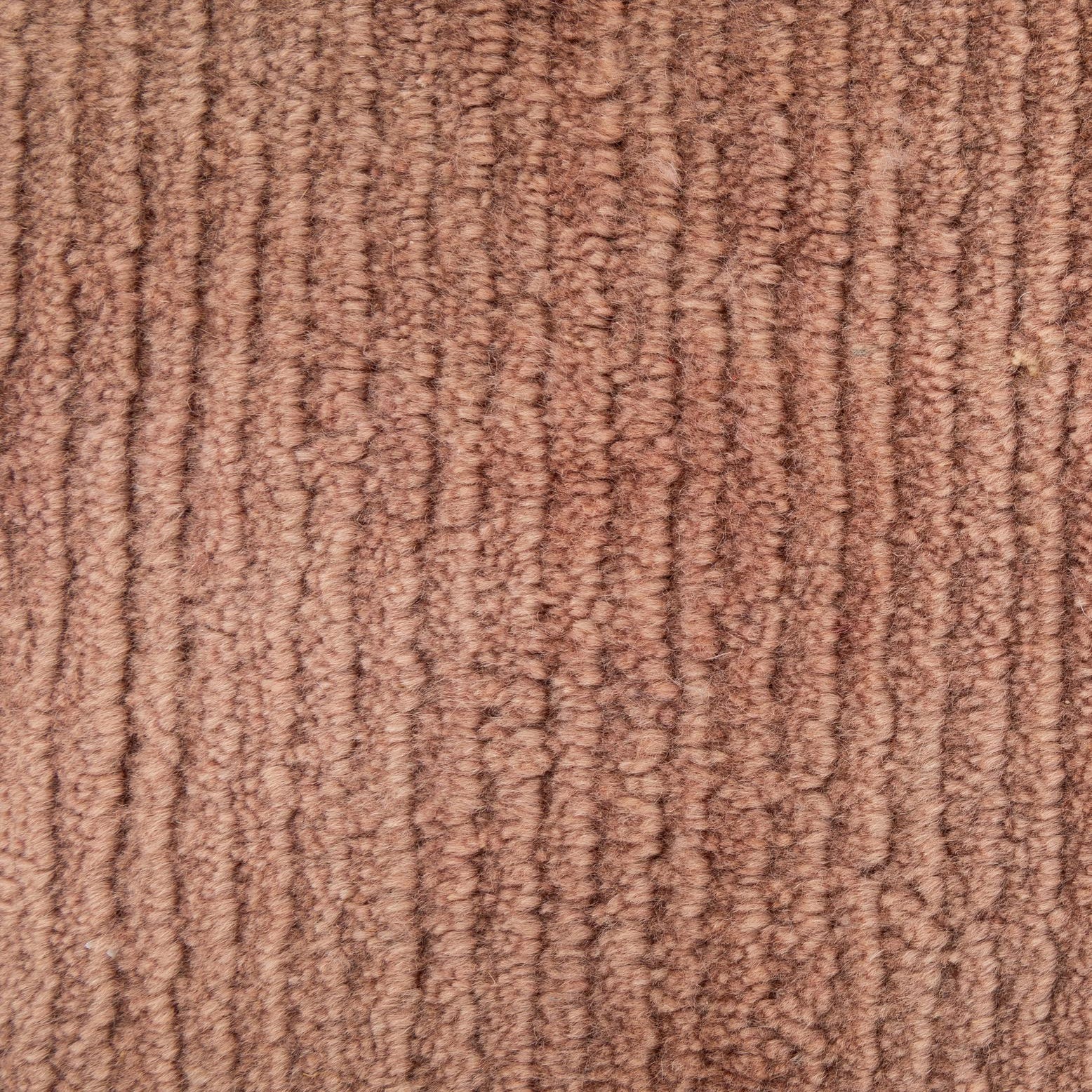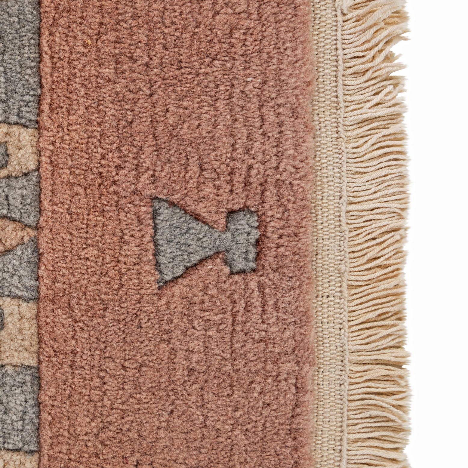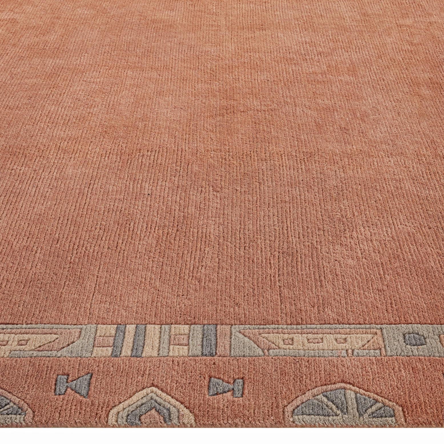 Hand-knotted from 100% wool, this rug presents a warm light pink field with a softly ribbed surface that feels dense and velvety underfoot. A narrow border in ivory and light blue frames the field with simplified geometric motifs, offering a quiet, traditional-inspired look with a modern restraint. The low pile and tight knotting give the surface a subtle sheen and a tactile depth that invites touch.