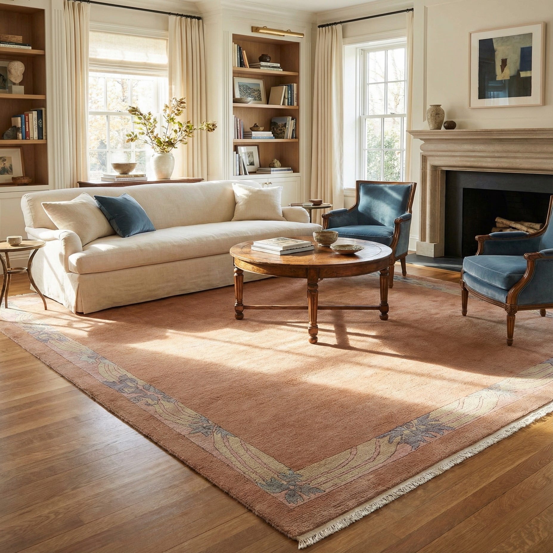 A rectangular 8x11 pink wool area rug with a modern oriental border pattern in muted blues, greens, and creams.