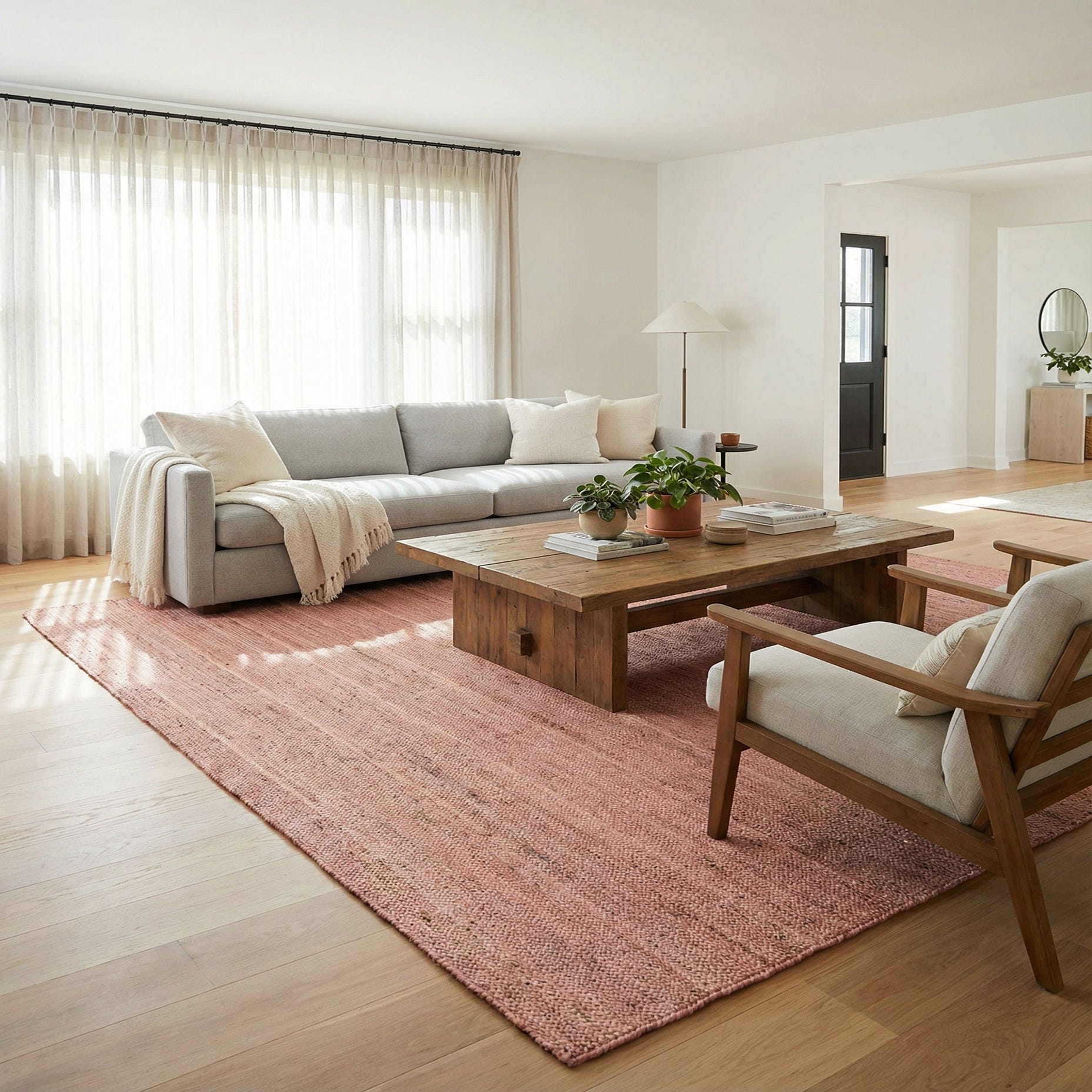 Hand-braided of 100% jute, this rug brings a gentle, tactile presence with a light pink ground threaded through with natural jute flecks and tonal striping. The surface has a low-profile, braided texture that reads linear from a distance and shows subtle variations up close—thin braided rows create a quiet stripe effect while the natural fibers add warm beige and light tan specks for depth. The matte finish and firm hand give the rug structure under furniture while still feeling grounded and natural beneath bare feet.