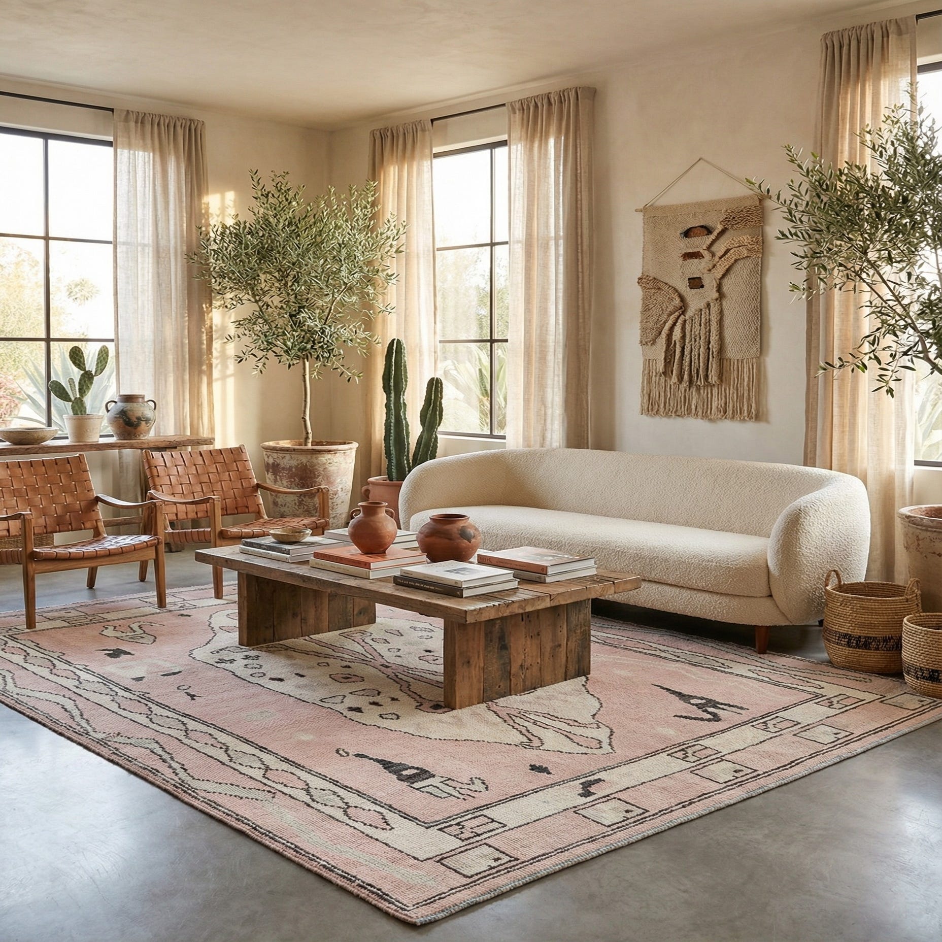 A 9x12 rectangular pink shag rug with a large off-white medallion and tribal motifs, perfect for a living room.