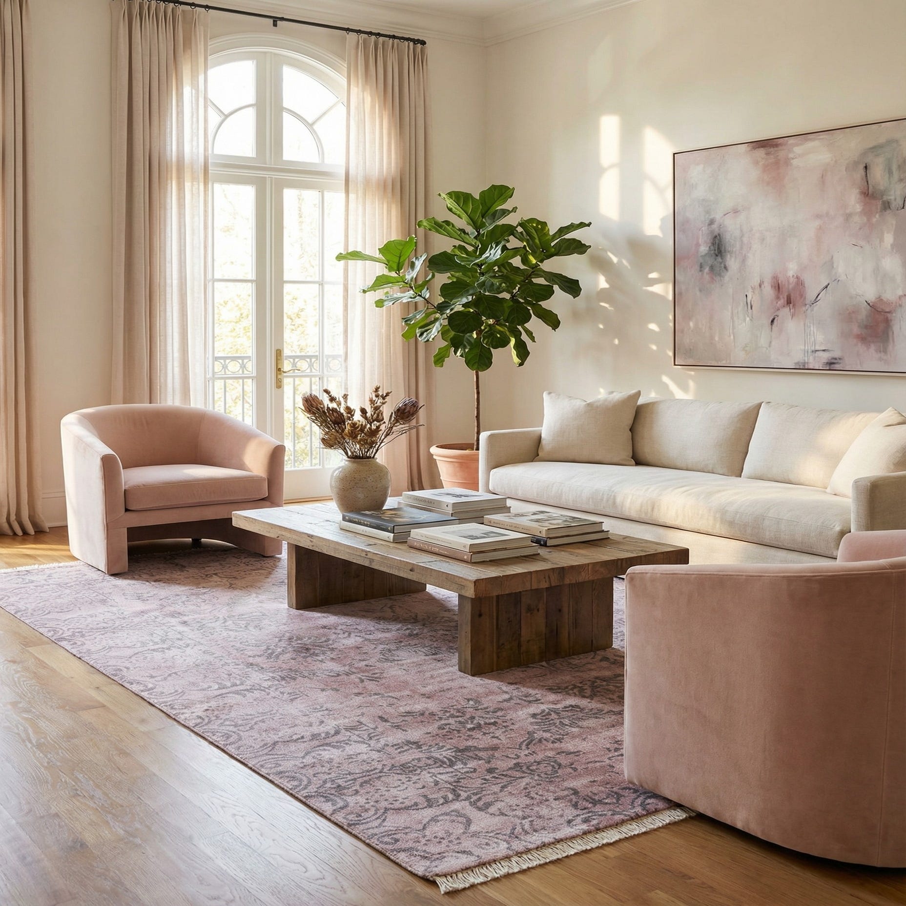 Primary color is Light Puce. Colors in this rug include: Light Puce, Gray, Puce.