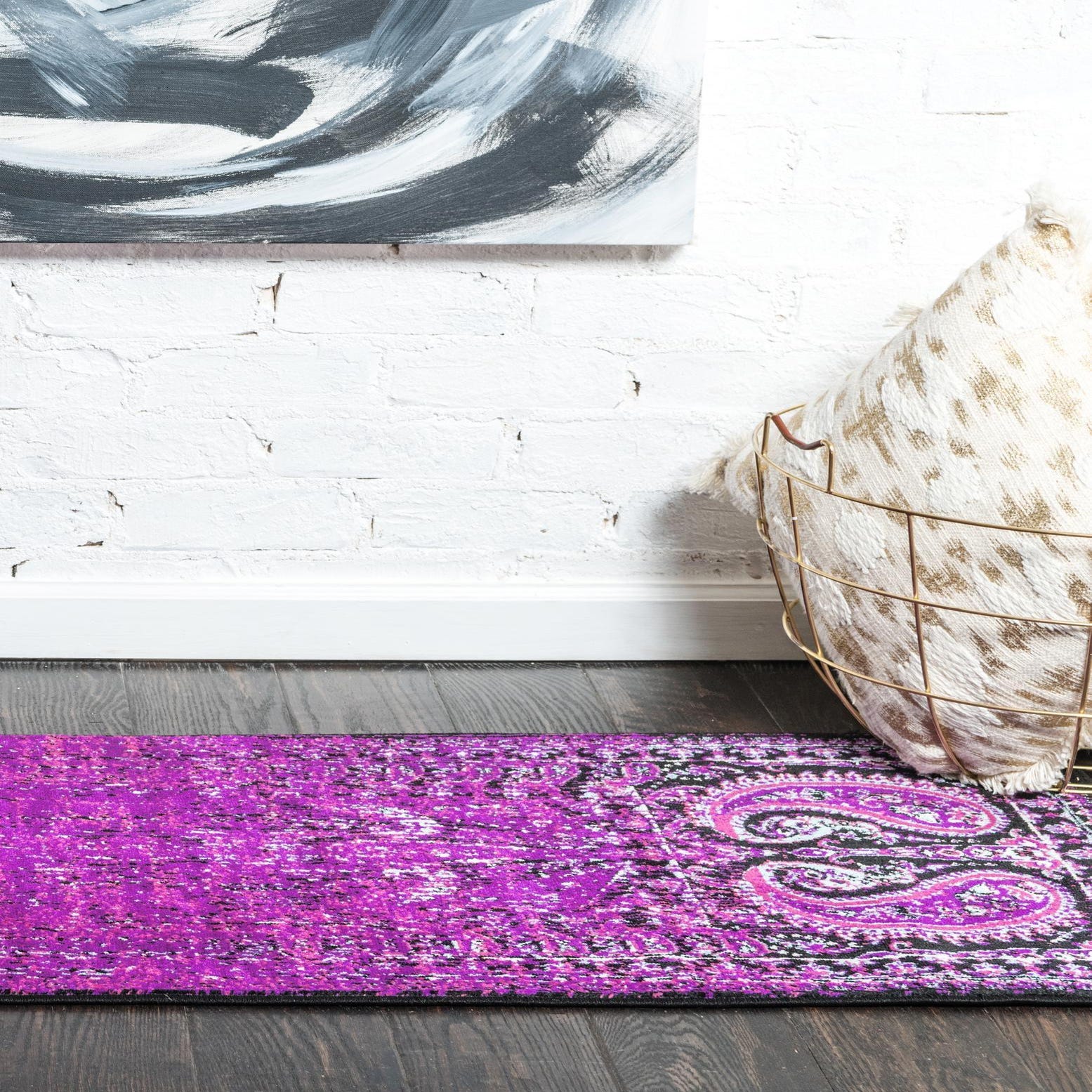 The array of colors and detailed patterns lend a modern touch with traditional roots to the piece, making it suitable for a variety of interior design scenarios. The lilac background offers a playful yet sophisticated canvas, which can serve as a focal point in minimalist spaces or harmonize with more eclectic decor. This rug would work well in a contemporary living room, a chic hallway, or an artistically inclined office space, providing both visual interest and functional value. The textured finish and intricate paisley motifs add depth to the design, inviting touch and enhancing visual appeal.