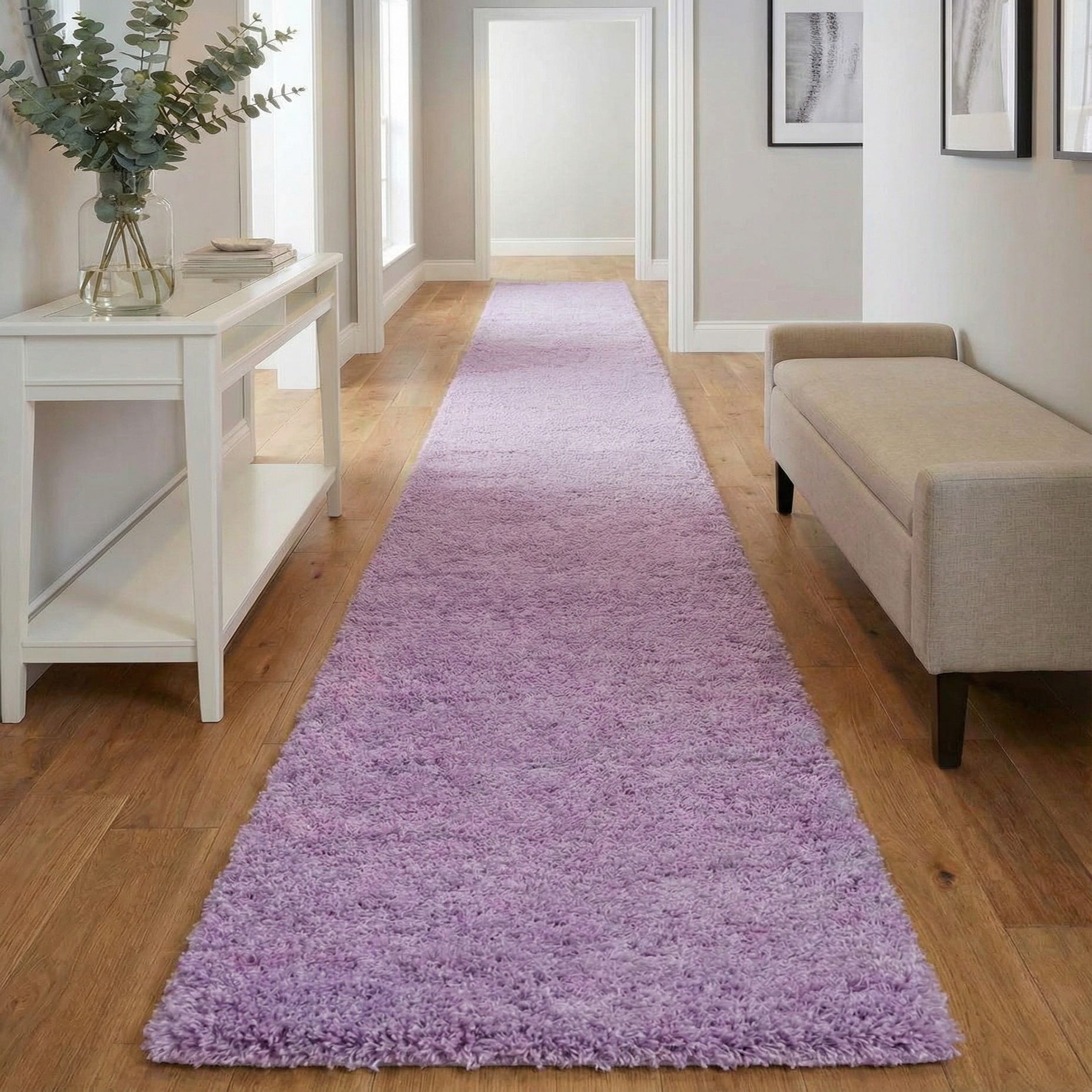A plush, solid lilac shag with a deep, even pile, this runner delivers a smooth field of color with subtle depth from the long polypropylene fibers. Machine-made from 100% polypropylene, the rug has a soft, cushiony hand and a gentle lustrous finish that catches light as the pile shifts. The lack of pattern keeps the look clean and contemporary while the dense shag texture adds tactile warmth underfoot.