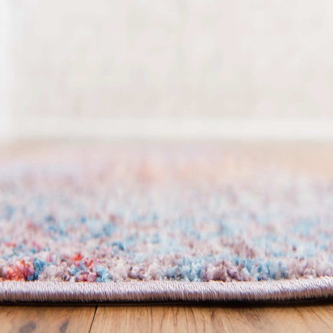 A soft lilac ground sets the tone for a subtle, vintage-inspired geometric design. Small diamond medallions repeat across the surface in a gently distressed layout, while bands of color drift across the field to create a watercolor-like gradient. Pops of blue and navy, warm gold and orange, and deeper purple notes appear within the pattern, producing a layered, multidimensional look that balances calm and energy.