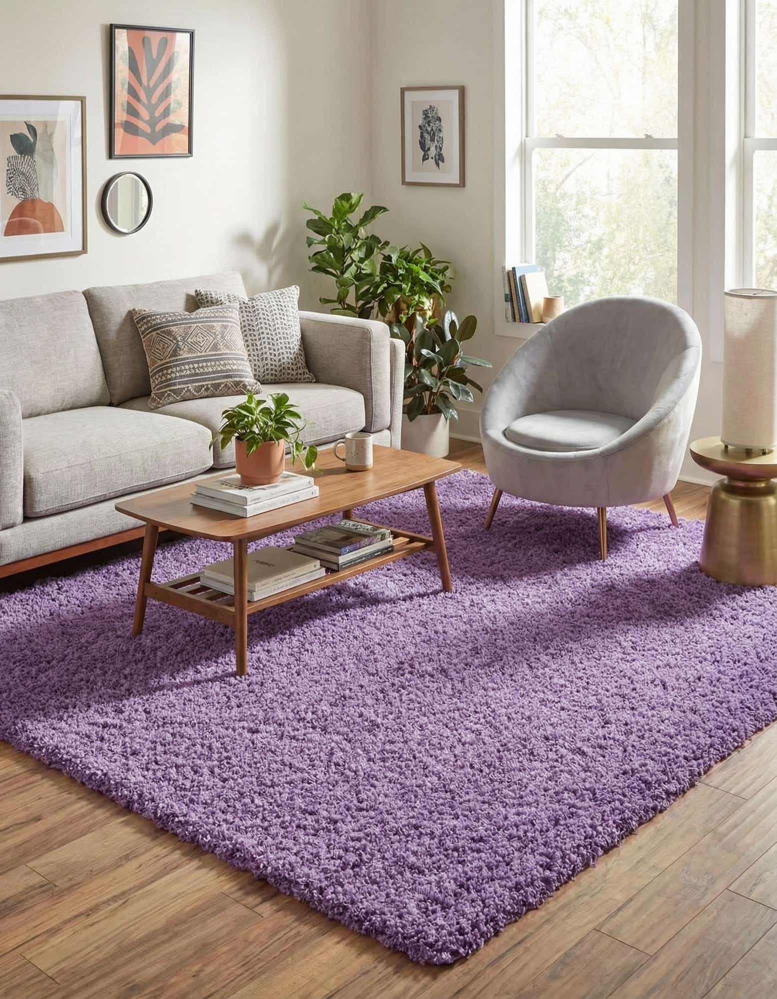 Place this rug in a bedroom or reading nook to introduce a calming, pastel layer against warm wood floors and crisp linens. It also complements contemporary living rooms—pair it with neutral sofas and metallic accents for a refined contrast—or use it in a youthful space or nursery to add a cozy, approachable touch of color. The lilac tone works well with whites, grays, blushes, and natural textures for a balanced, stylish interior.