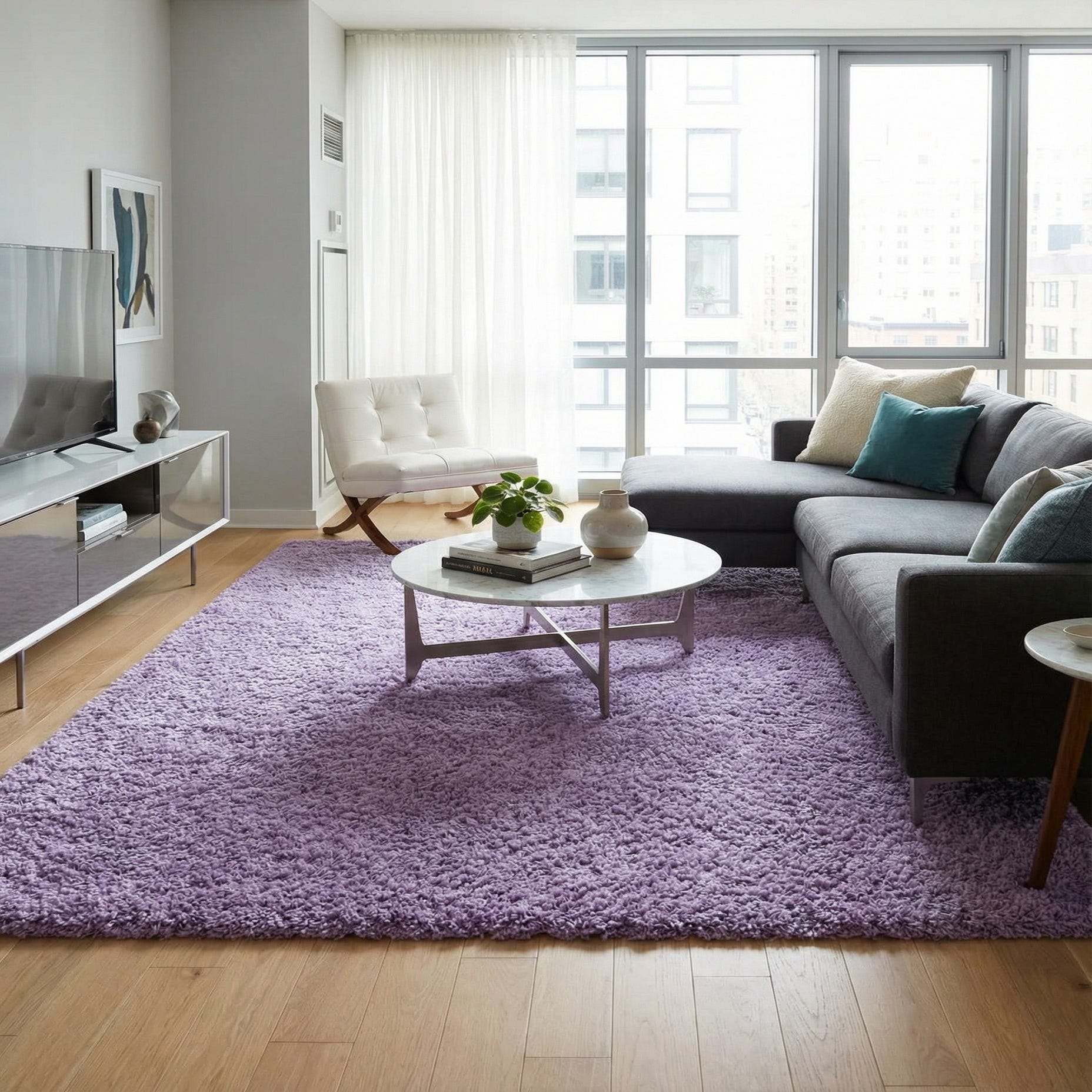 A soft, plush 8x10 rectangular shag rug in a vibrant lavender-purple color, ideal for a modern living room.