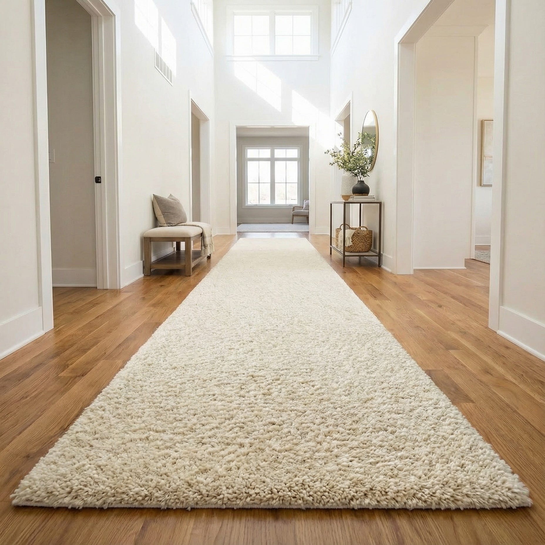 A long, plush Zermatt Shag runner rug in a solid ivory and cream color, perfect for a hallway.