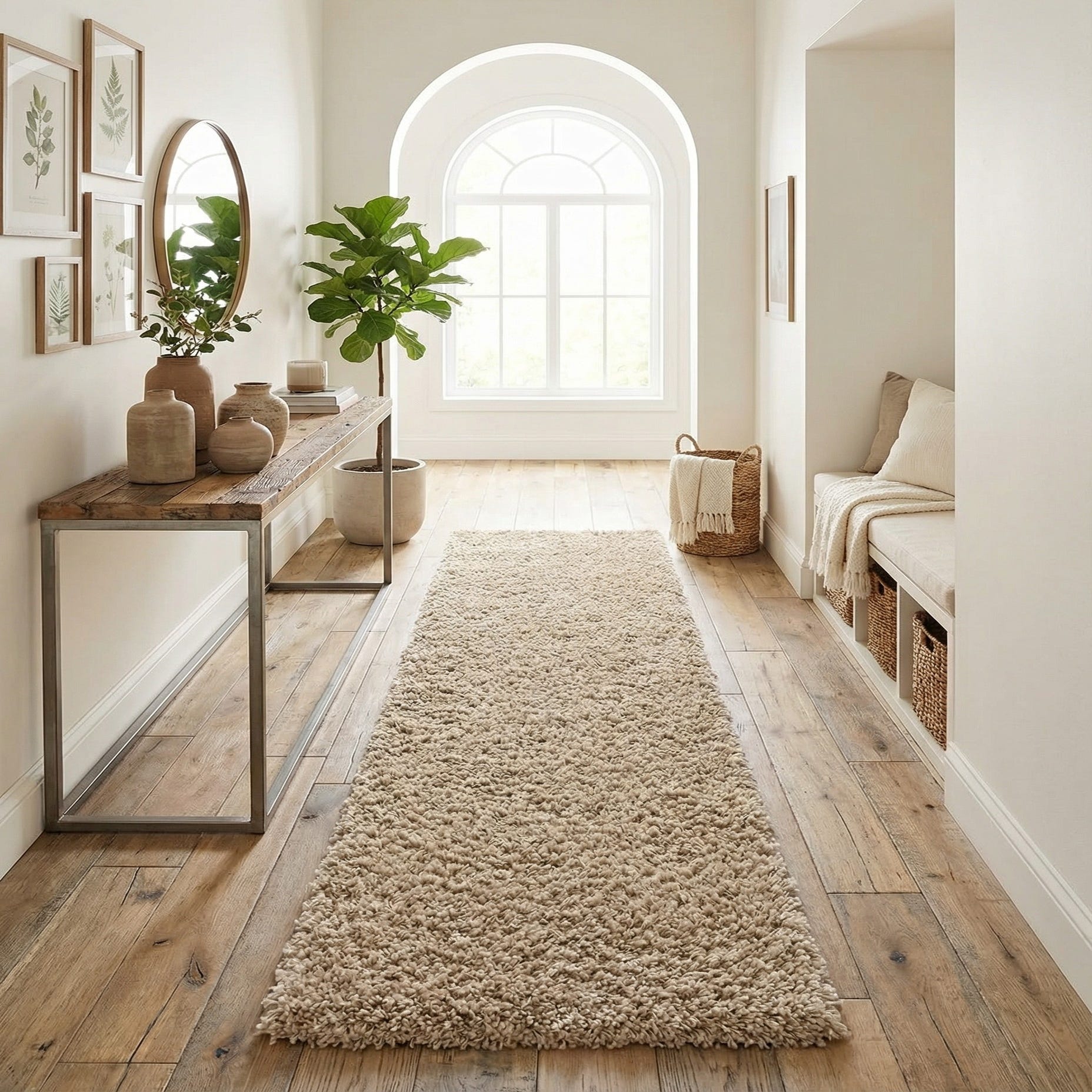 A long, plush Zermatt Shag runner rug in a solid ivory and cream color, perfect for a hallway.