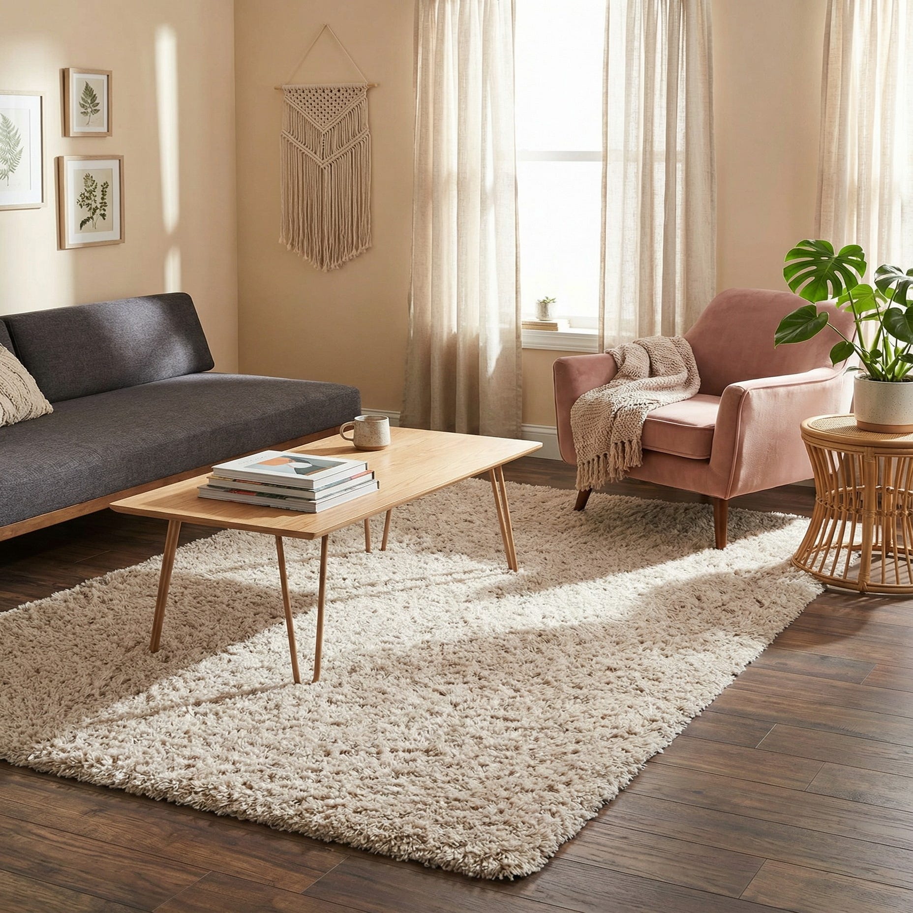 The tactile warmth of this piece works well layered in a living room to soften hardwood or tile, tucked under a bed to add cushion where you step in the morning, or placed in a reading nook to create a cozy corner. It pairs naturally with Scandinavian, contemporary, and transitional interiors—think light woods, linen upholstery, and muted accent colors—but also provides a calming base for bolder patterns when you want contrast without competing texture.