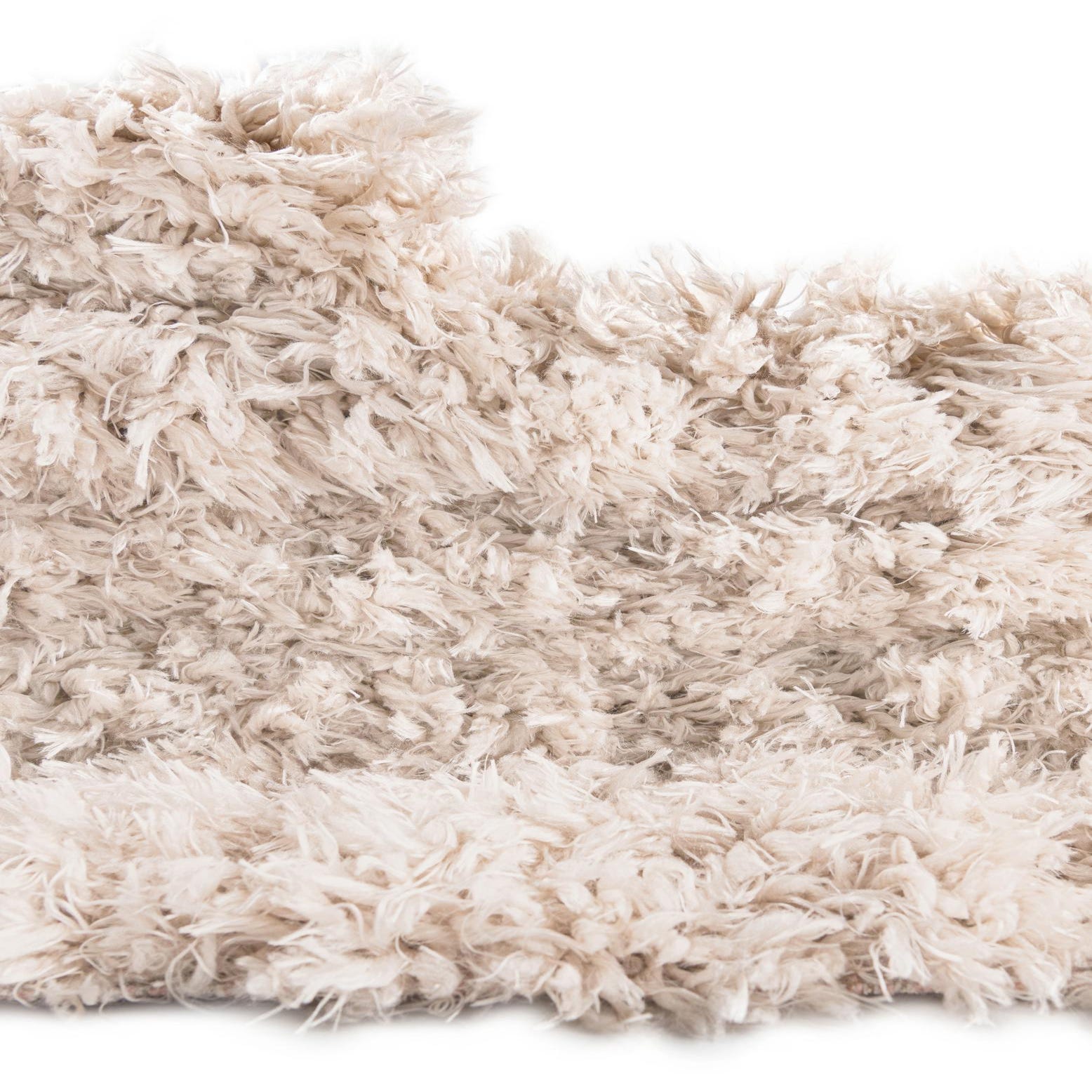 A plush, high-pile shag runner in a warm linen tone, crafted with machine-made construction from 100% polyester. The surface presents an all-over shag pattern with dense, long fibers that create subtle tonal variation and depth as the pile shifts. This casual, contemporary style offers a tactile, inviting texture that brings softness to narrow spaces without visual clutter.