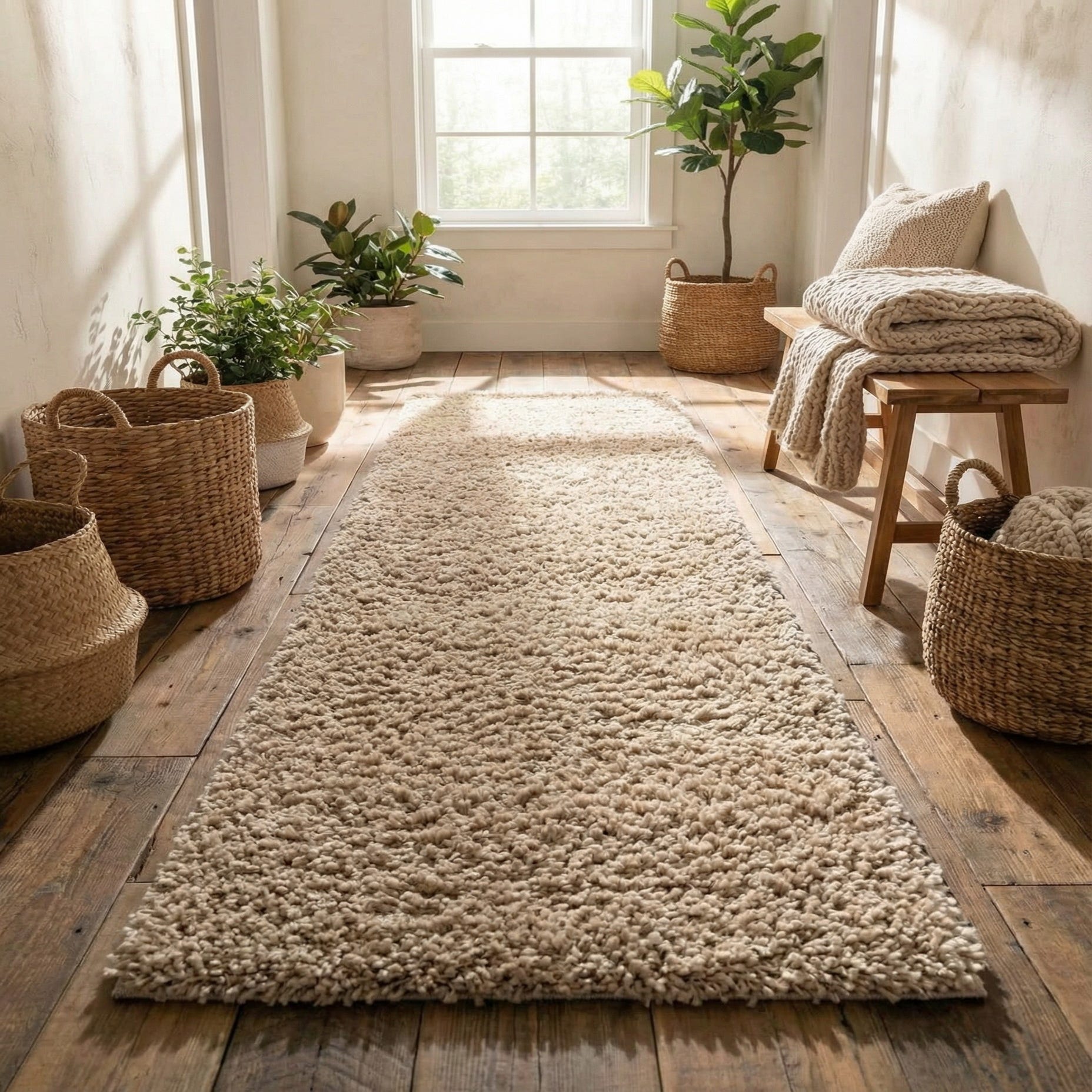 A soft, plush Zermatt Shag 8 Ft runner rug in a solid ivory and cream color, perfect for a hallway.