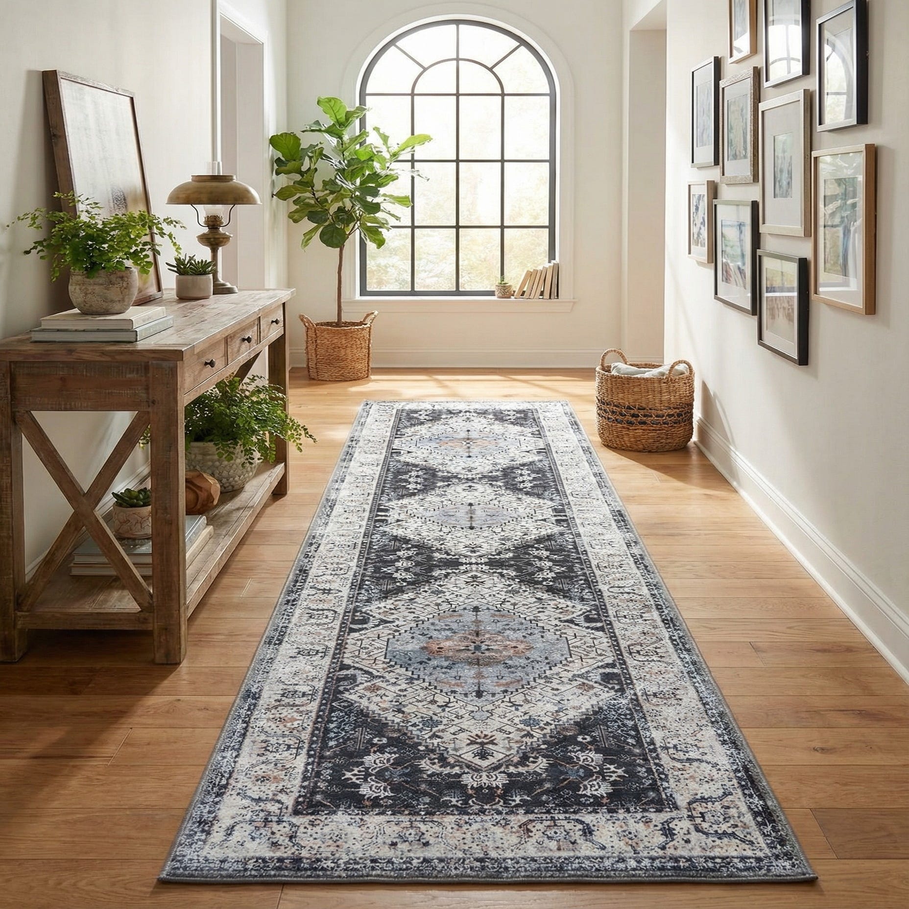 Ideal for long, narrow spaces — use it to define a hallway, entry, or galley kitchen — or place it down the center of a living room to connect seating areas. It pairs well with light wood floors, neutral upholstery, and coastal or transitional schemes that pull subtle blues and warm neutrals into the palette; it also complements leather or darker wood pieces where the Linen Charcoal background can provide contrast.