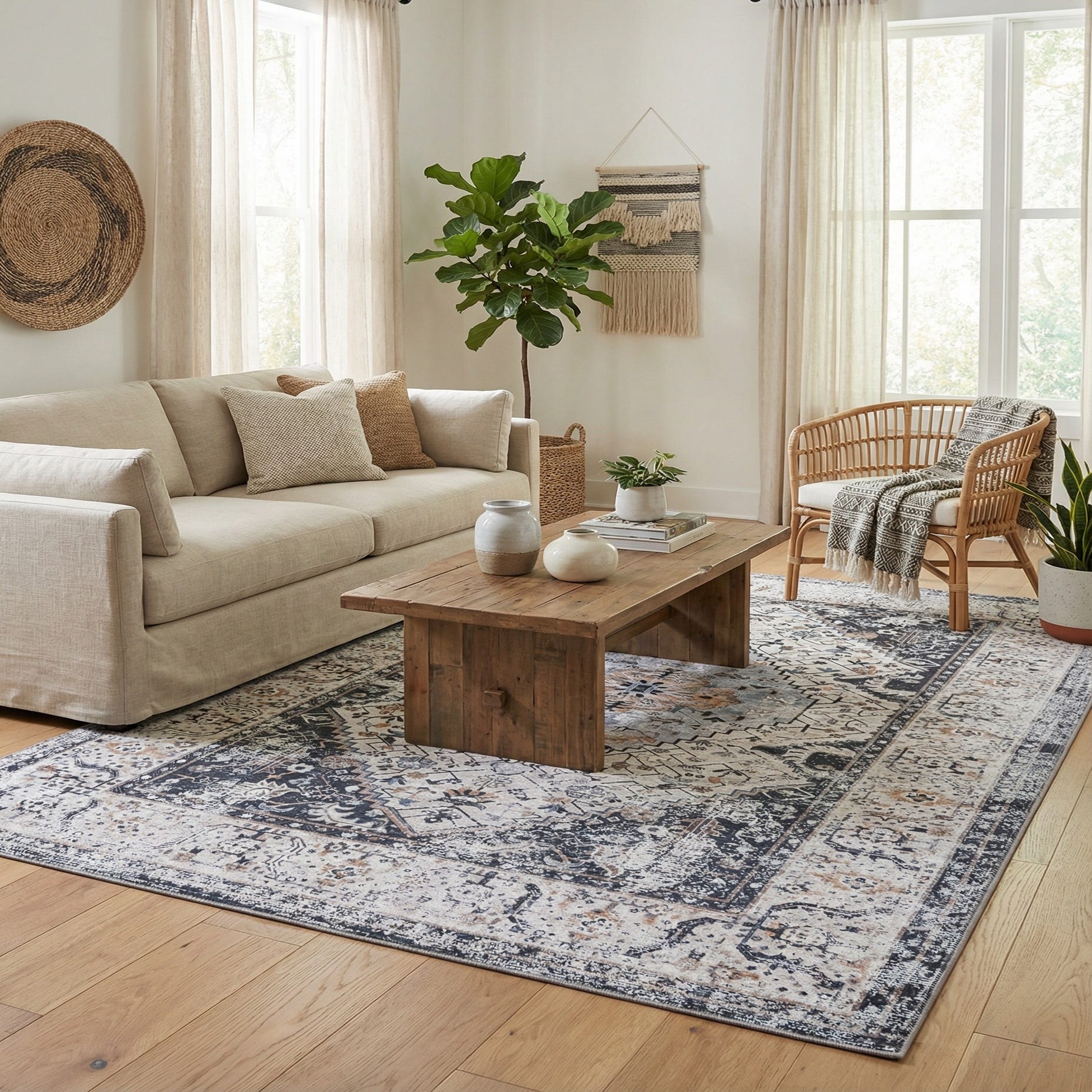 Primary color is Linen Charcoal. Colors in this rug include: Linen Charcoal, Beige, Ivory, Light Blue, Light Brown, Gray.