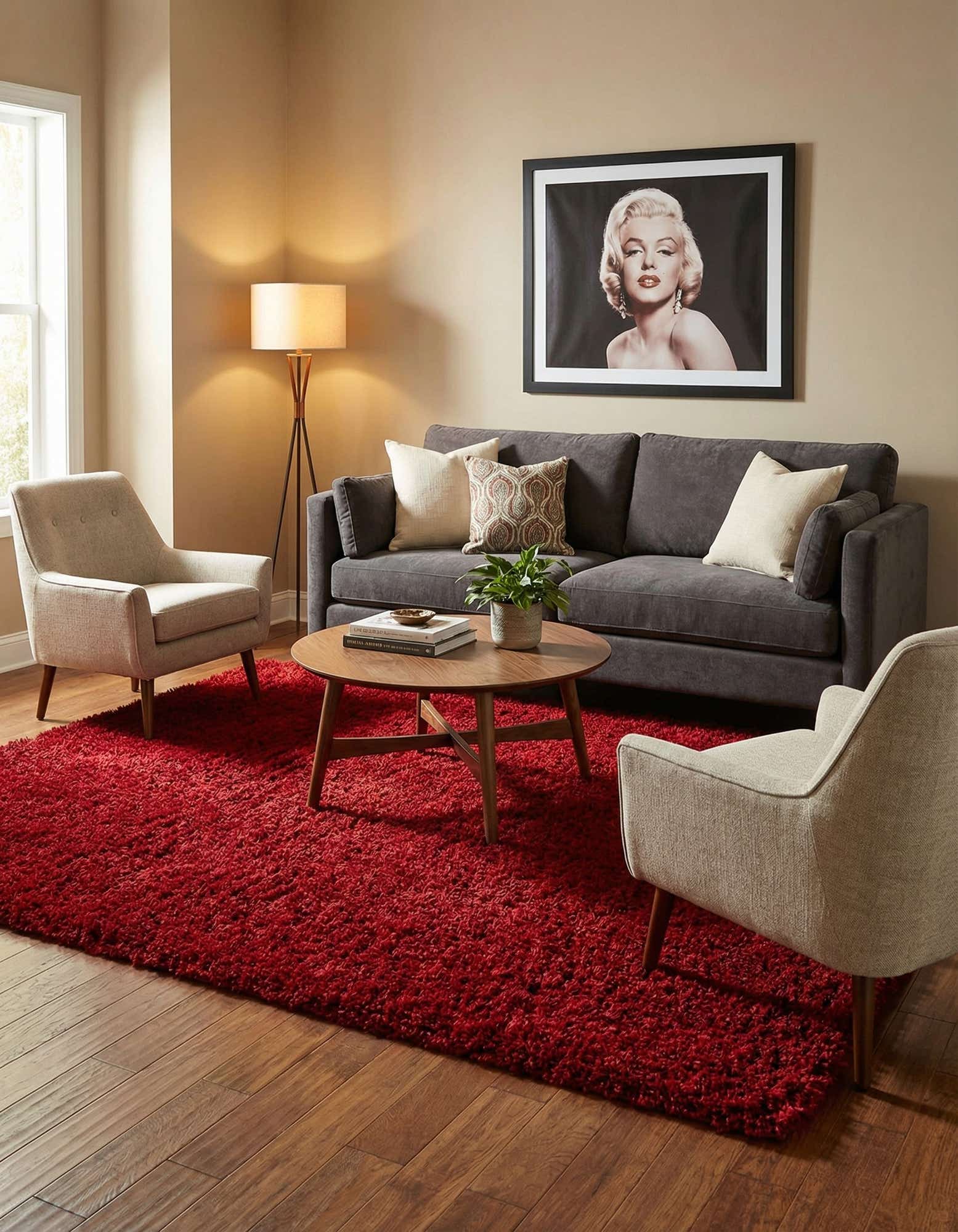 A plush, rectangular 8x10 Marilyn Monroe Shag rug in a deep red color, perfect for a living room.