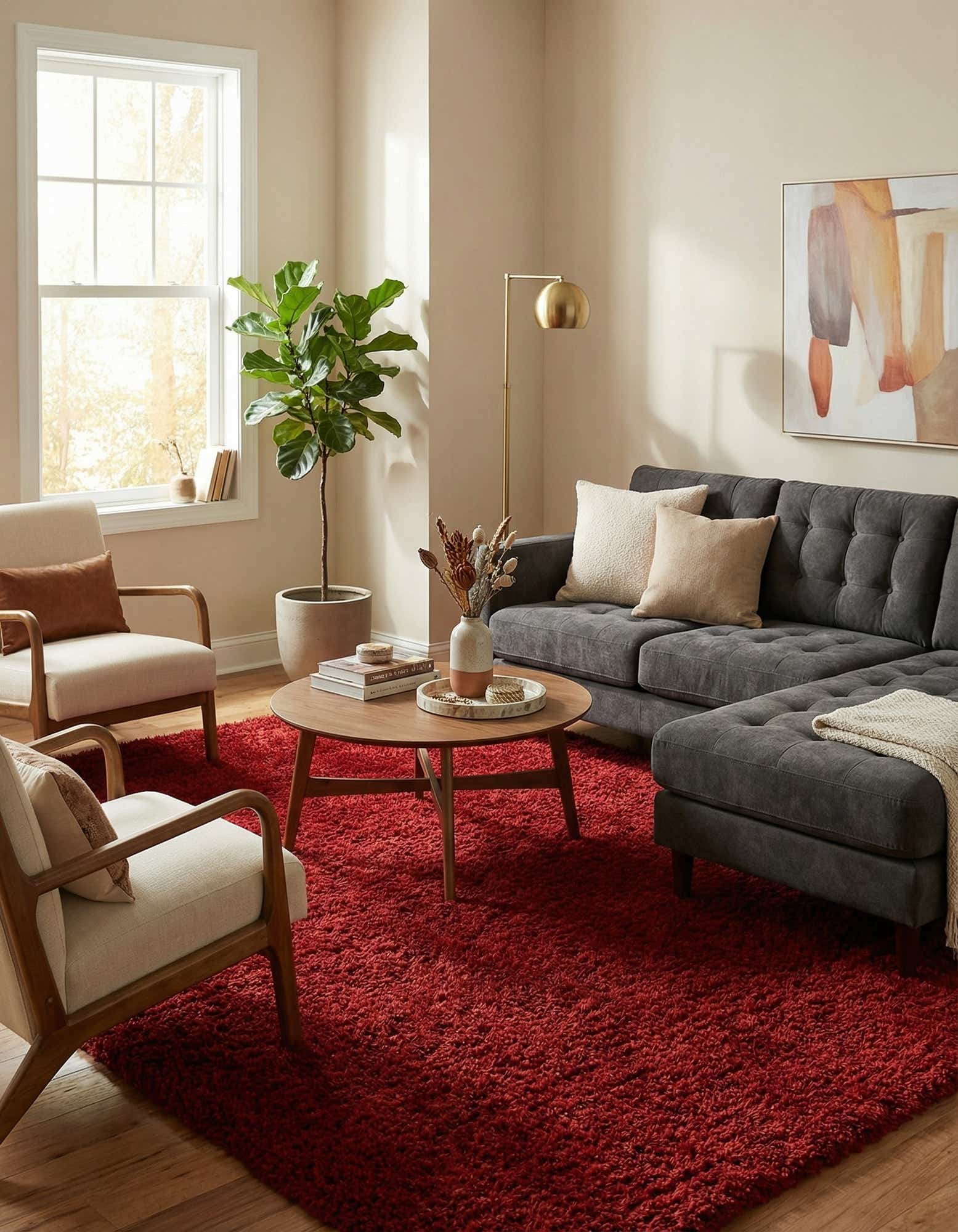 This rug works well as a color anchor in contemporary living rooms, cozy bedrooms, or a media lounge where warmth and texture are important. Pair it with neutral upholstery and warm wood tones for balanced contrast, or introduce metallic accents and glass surfaces for a modern, slightly glamorous effect. Because of its dense shag and polyester pile, it’s well suited to spaces where you want a comfortable underfoot feel and a strong visual statement.