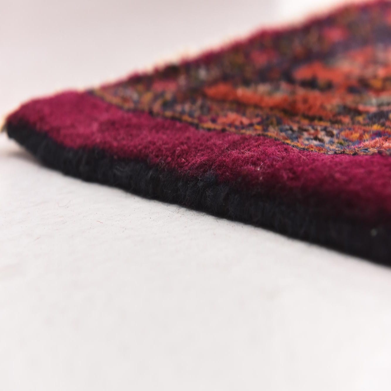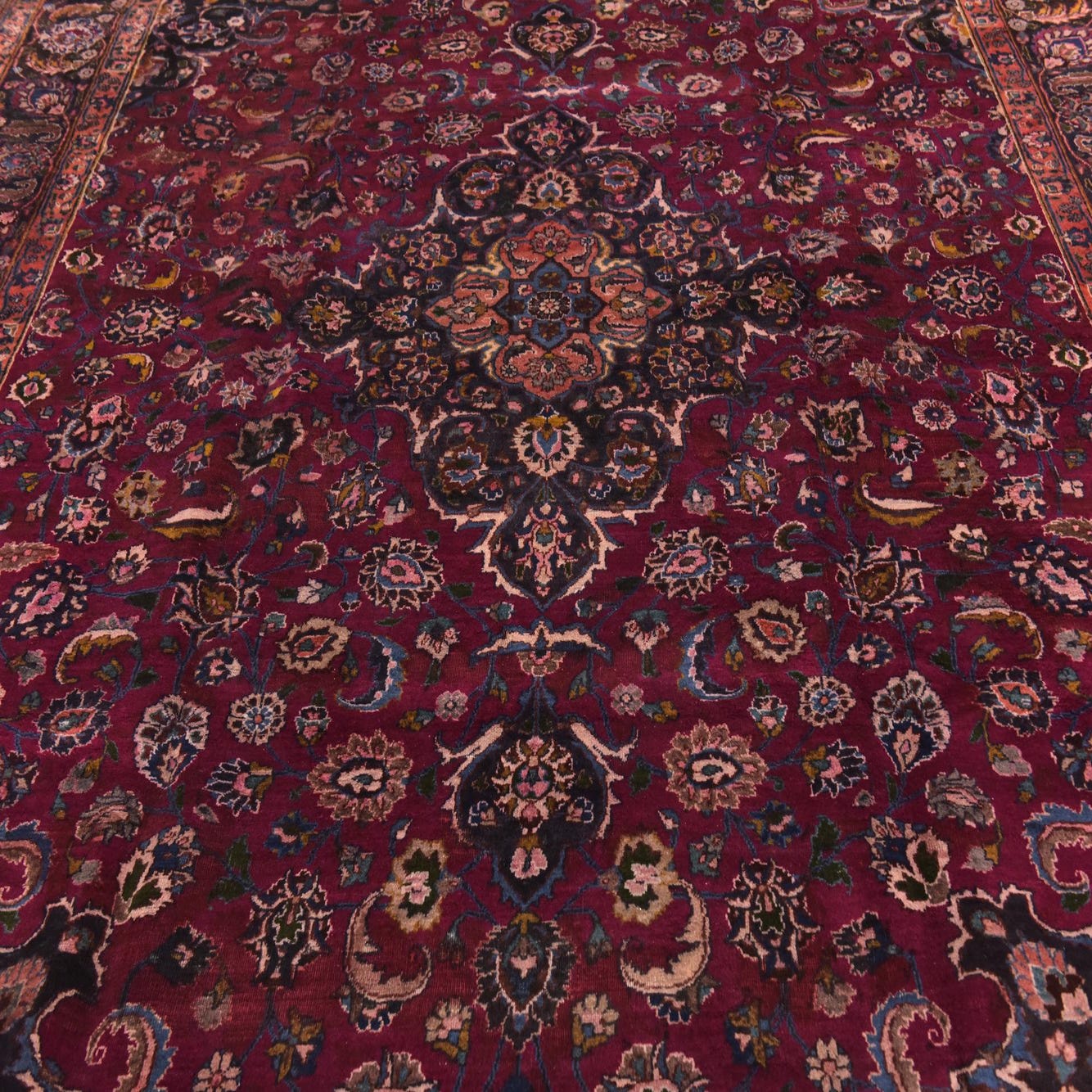 The Mashad collection presents a hand-knotted 100% wool rug that offers a sophisticated foundation for any room's decor. Spanning an ample 10x13 feet, this piece showcases a rich magenta background, creating a warm and vivid canvas for the intricately woven design. Patterns flourish throughout the rug, featuring a classical arrangement of florals and arabesques, with accent colors that include beige, black, blue, brown, green, gold, ivory, navy blue, orange, and pink. The palette is carefully balanced, allowing each hue to contribute to the overall opulence without overwhelming the senses.