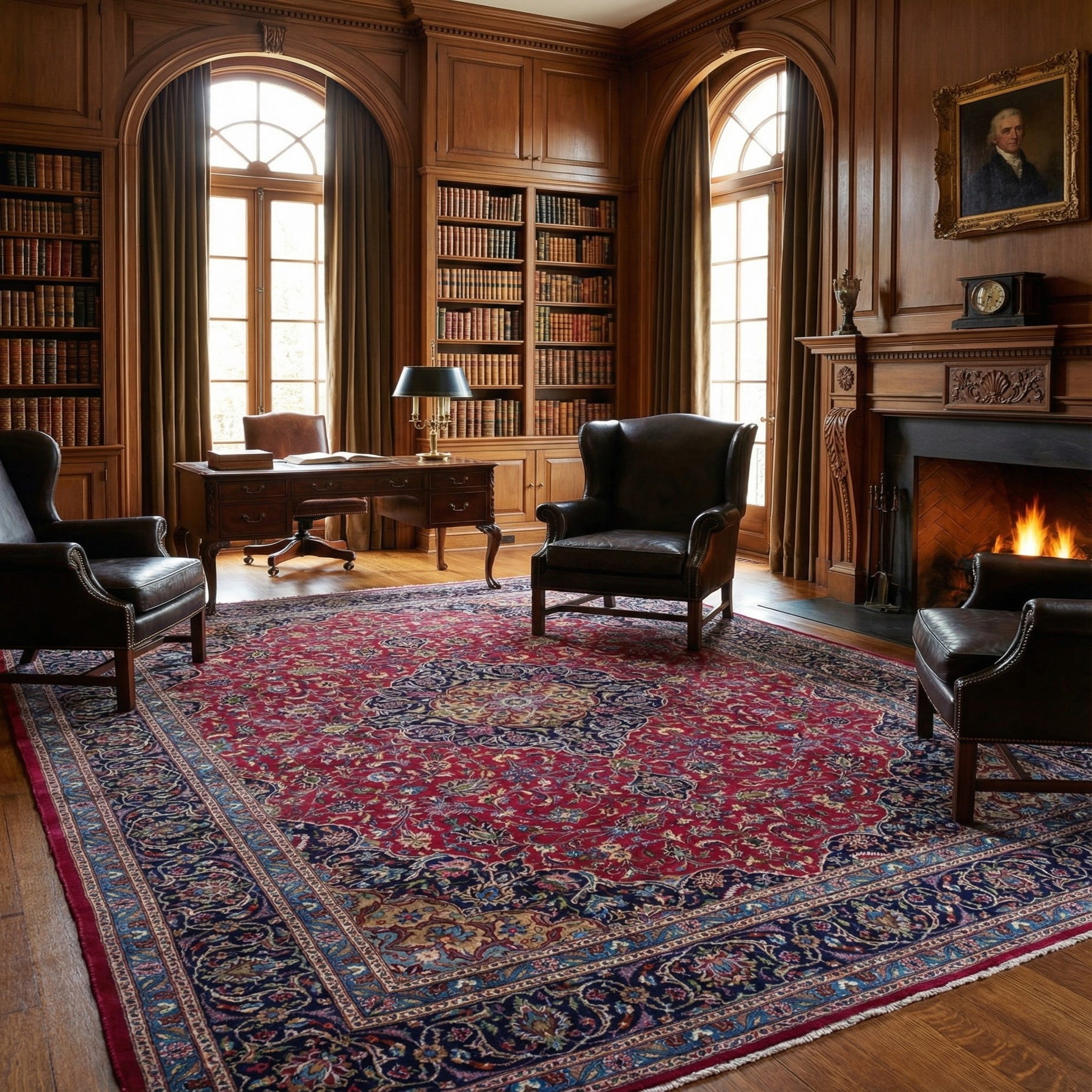 A large 10x13 rectangular Persian rug with a rich red field, intricate botanical patterns, and a central medallion, framed by a dark blue border.