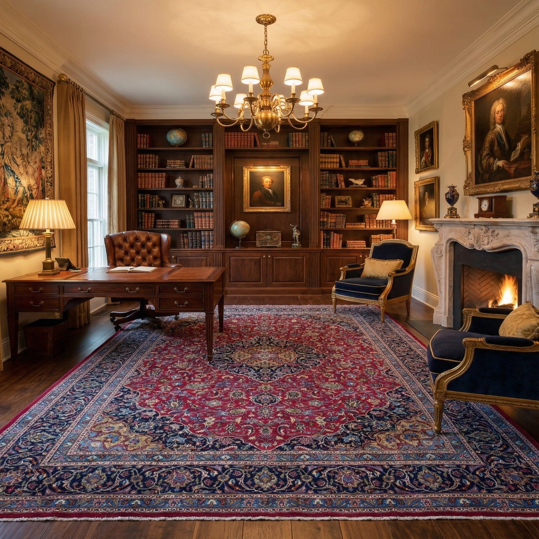 This Mashad rug's noble character is well-suited for interiors that wish to evoke a sense of tradition and sophistication. Its large scale and distinct colors make it ideal as the foundation for a living room, dining area, or any space that calls for a touch of timeless elegance. The robust nature of this rug would harmonize with rich wood tones, leather furnishings, and accents of brass or bronze for a stately and warm environment.