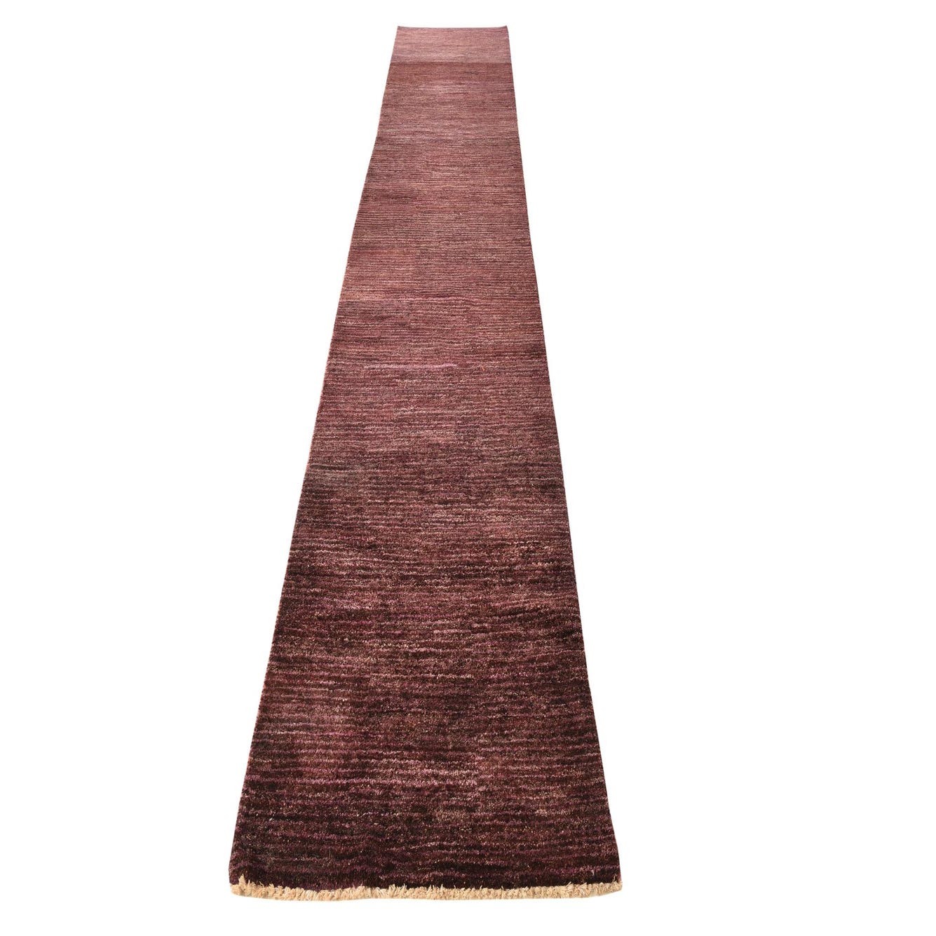 A long, thin 14 ft runner rug in shades of pink and red, featuring a modern abstract pattern with visible horizontal texture.
