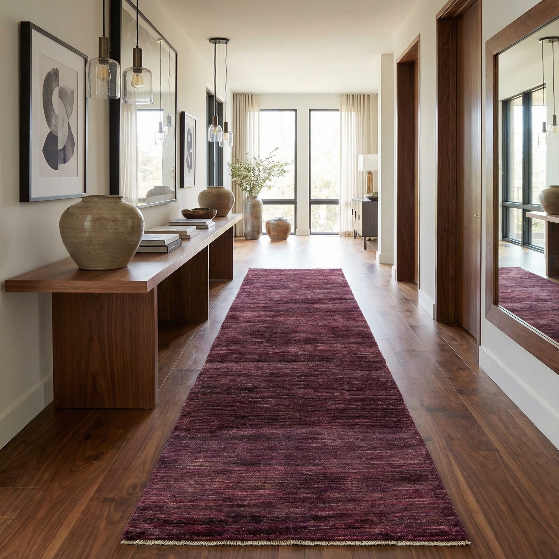 A 14 ft runner rug in shades of pink and red, featuring a subtle striped modern oriental pattern, ideal for a hallway.