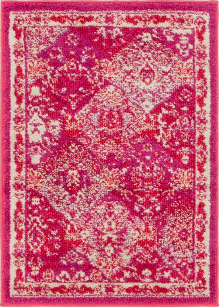 Primary color is Magenta. Colors in this rug include: Magenta, Ivory, Olive, Purple, Red, Violet.