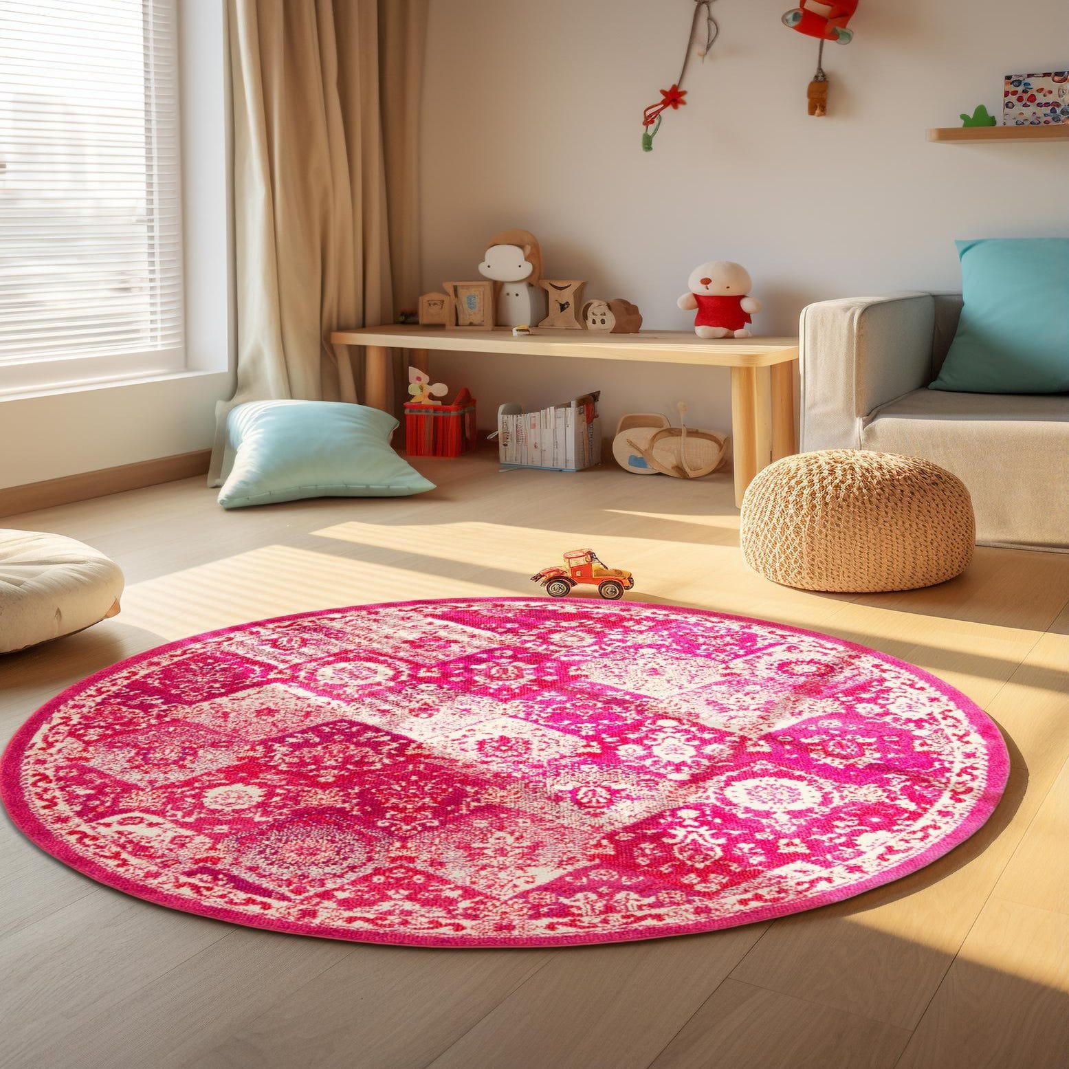 Primary color is Magenta. Colors in this rug include: Magenta, Ivory, Olive, Purple, Red, Violet.