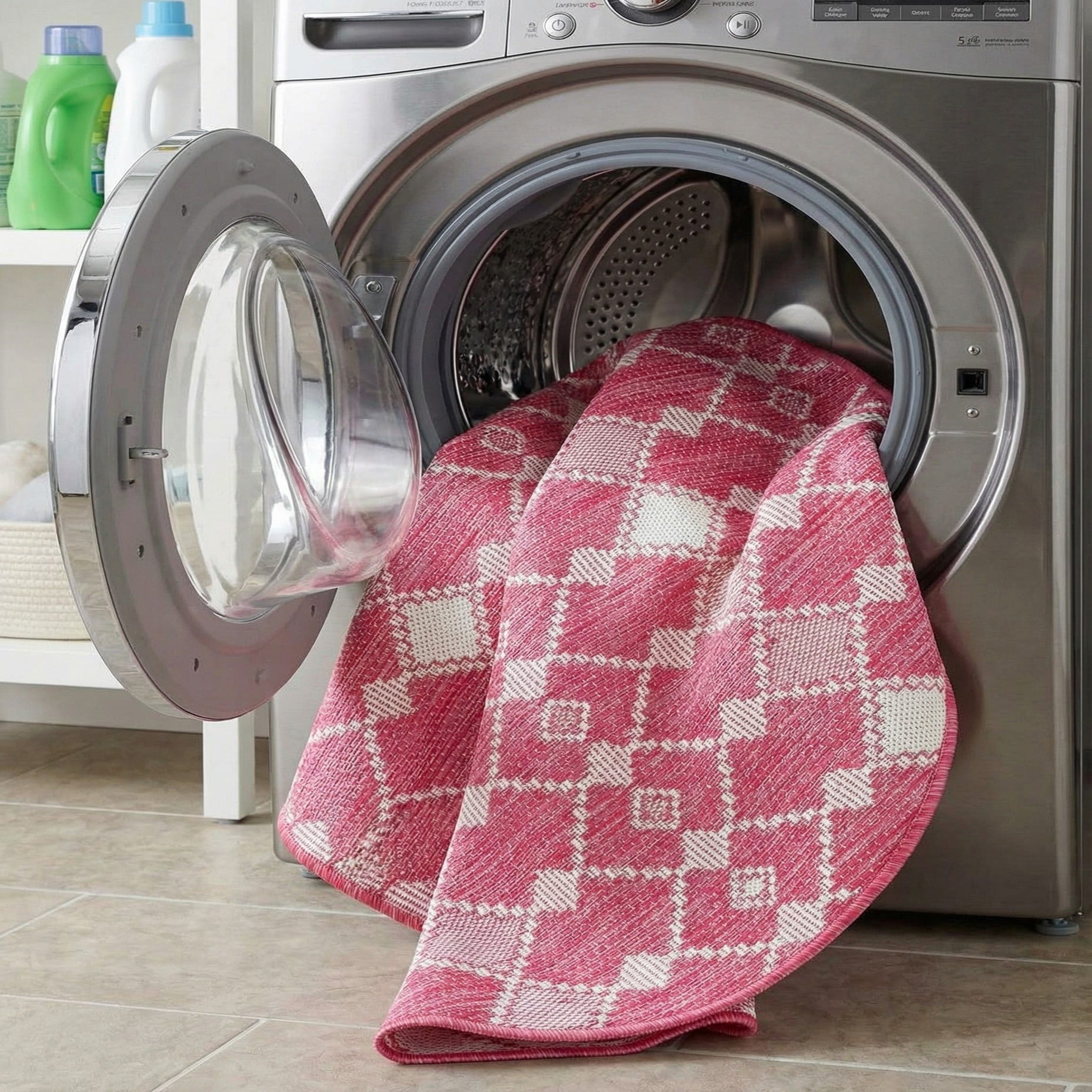 The Outdoor Lattice collection offers a dynamic 3 Ft Round rug, machine-woven of 100% polypropylene for resilience and longevity. This rug presents a striking lattice pattern, accentuated by a bold magenta background and contrasted with clean ivory hues, creating a vibrant visual statement. Its flatweave construction offers a smooth texture that is pet-friendly, shed-free, and capable of withstanding frequent traffic, making it a suitable addition to high-use areas.