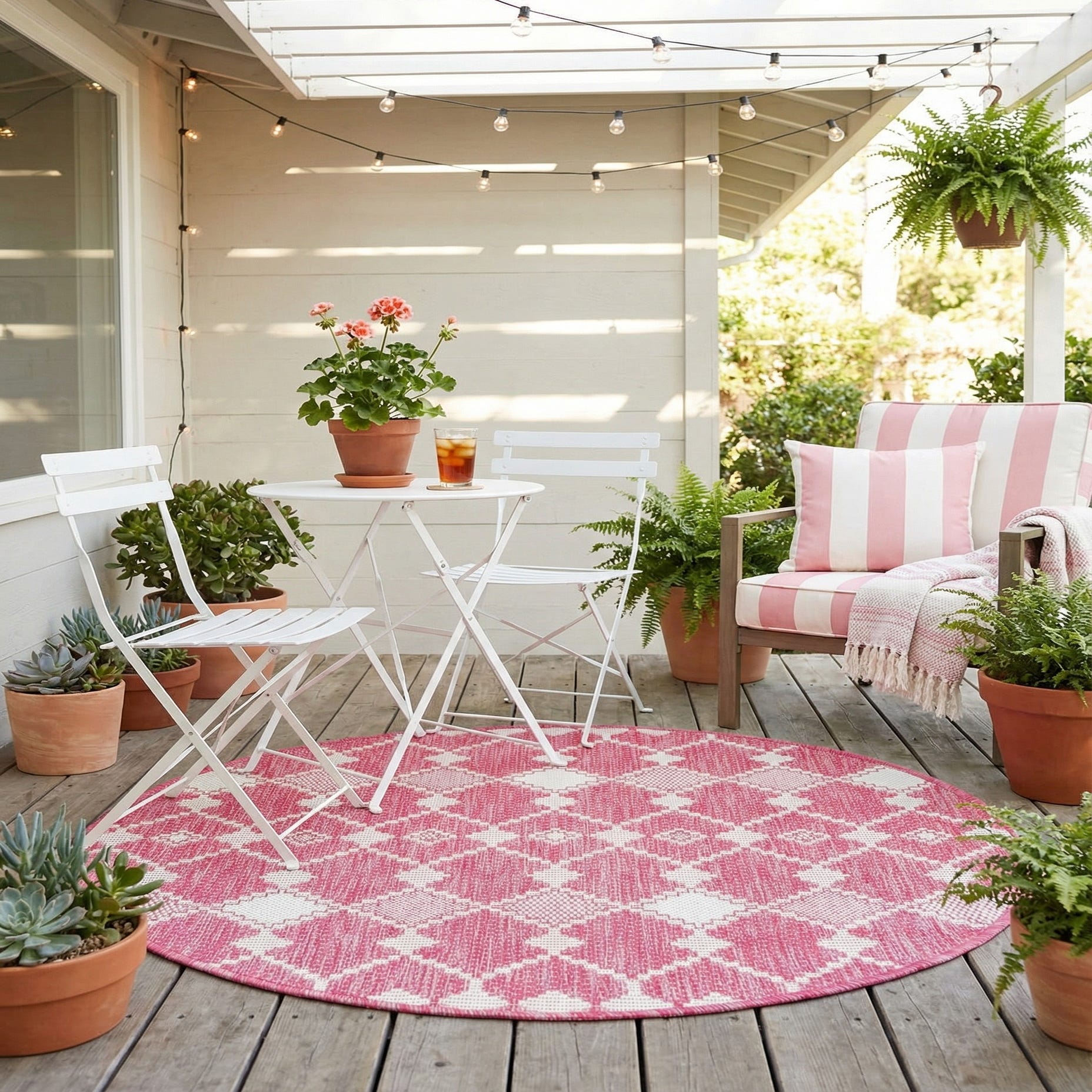 A vibrant pink and white round indoor/outdoor rug with a modern trellis pattern, perfect for a patio.