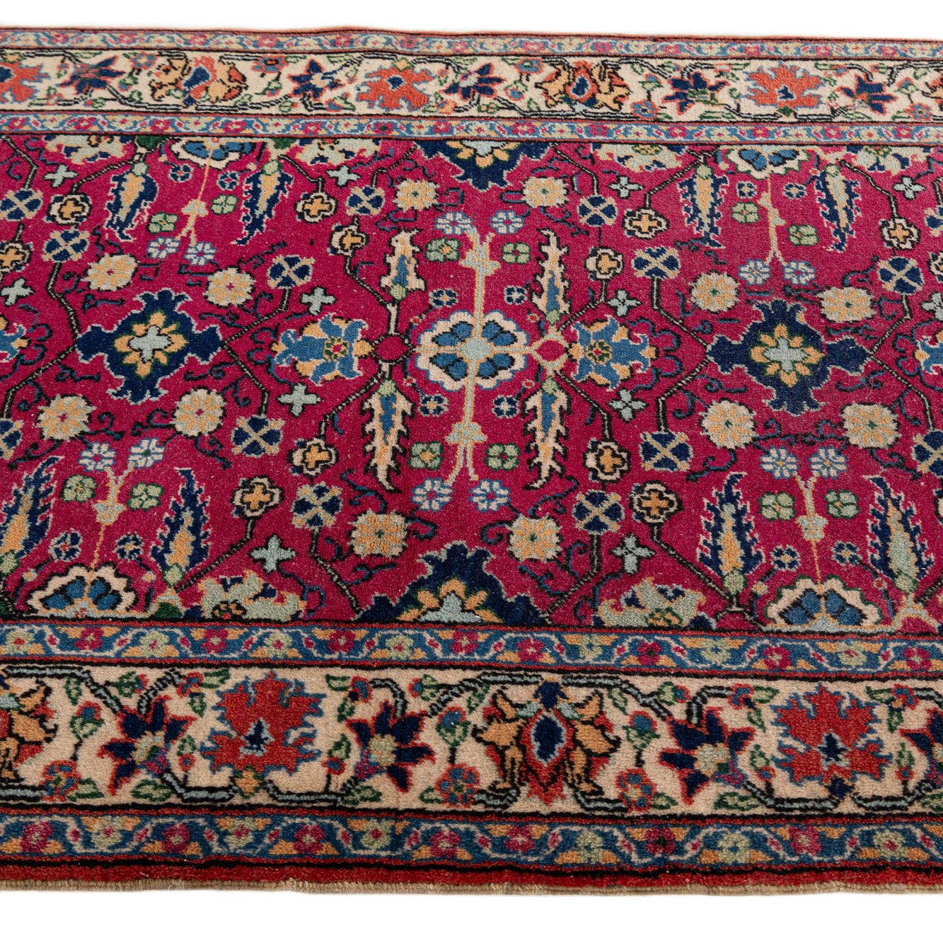 Primary color is Magenta. Colors in this rug include: Magenta, Beige, Black, Blue, Brown, Ivory, Navy Blue, Yellow, Light Blue.
