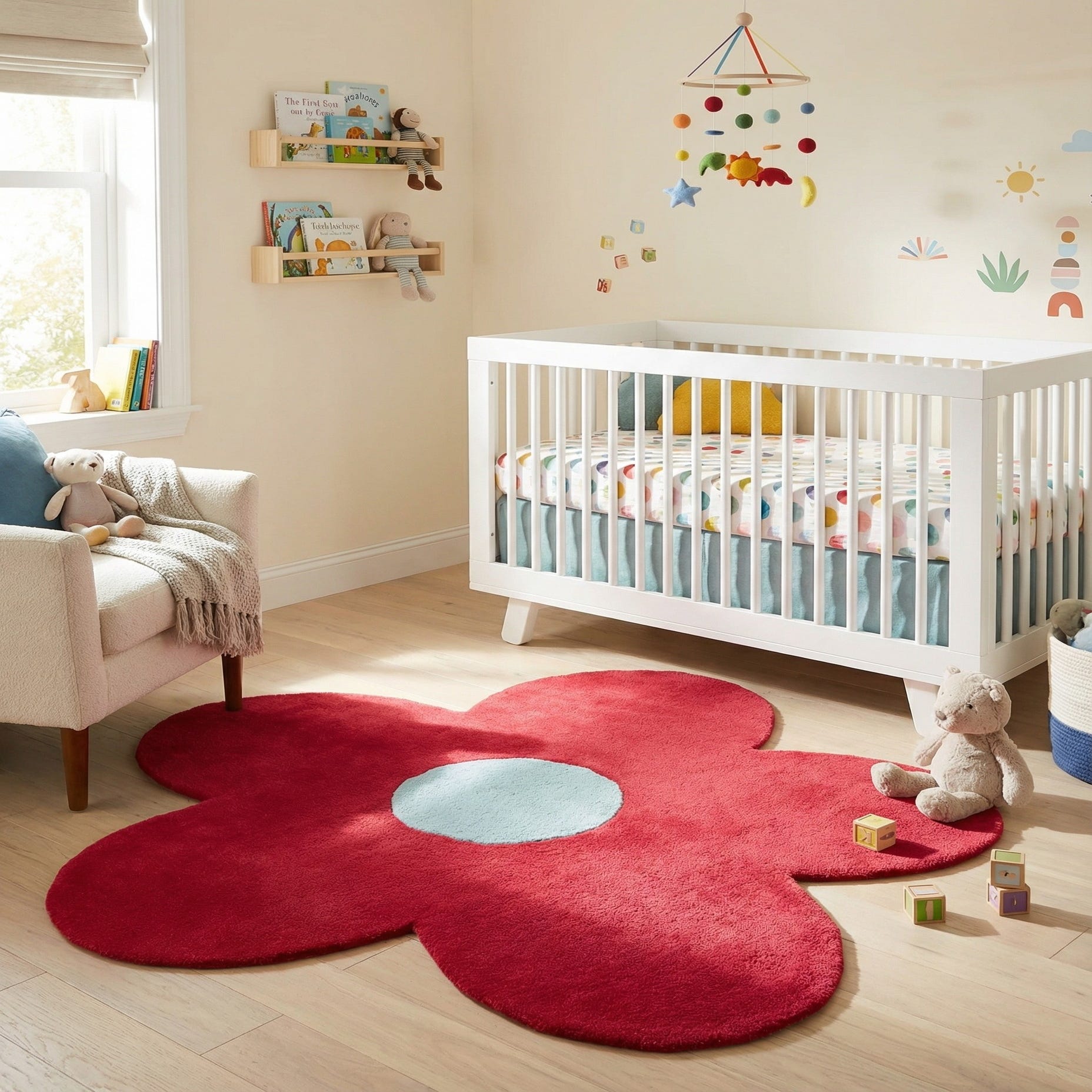 A vibrant red flower-shaped rug with a light blue circular center, featuring a high pile texture.