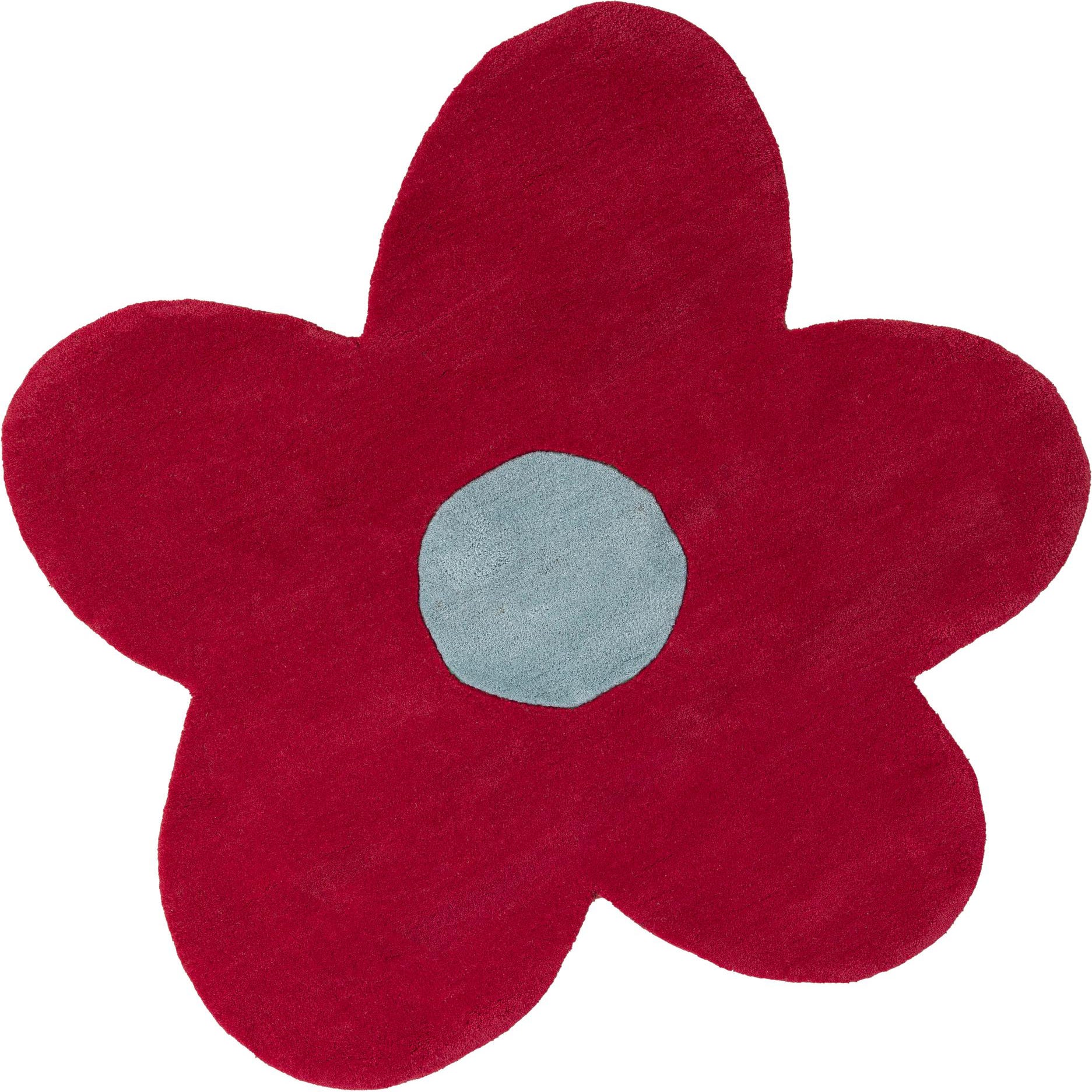 Hand-tufted from 100% wool, this playful flower-shaped rug has five rounded petals in a saturated magenta field with a soft light-blue center disk. The stylized floral motif and scalloped outline give the rug a modern, whimsical character, while the dense wool pile feels cushiony and warm underfoot. The short, plush texture holds the color well and gives the surface a subtly velvety touch that contrasts nicely with the cool tone of the center.