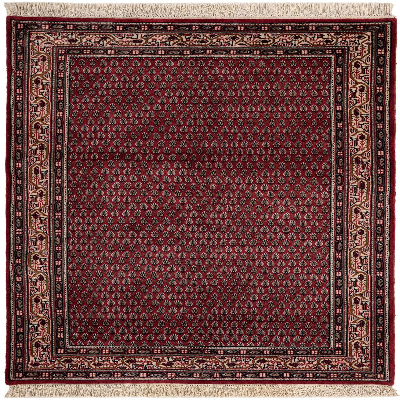 A 4x6 rectangular Mir rug featuring a traditional Oriental pattern in shades of red and pink with a detailed border and fringe.