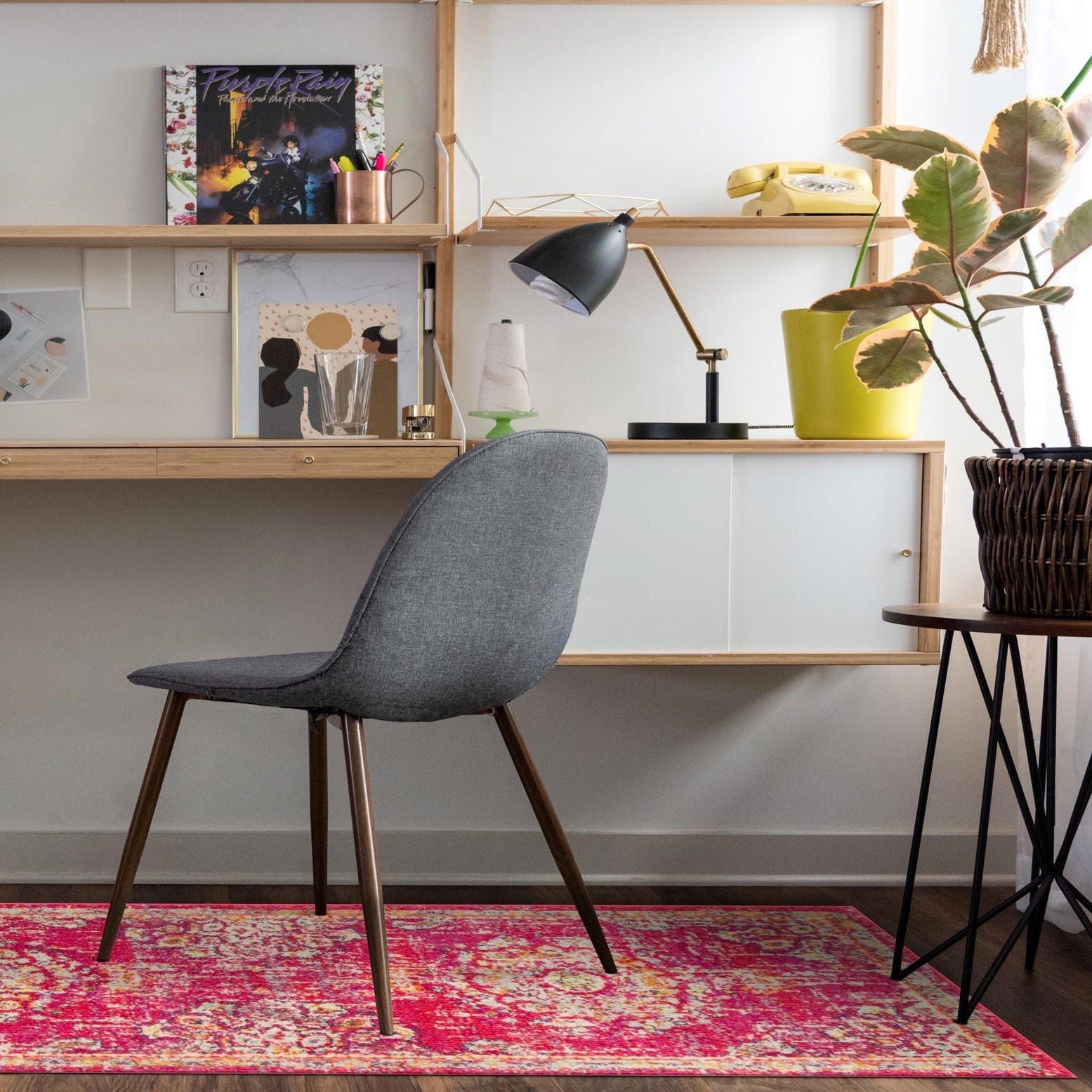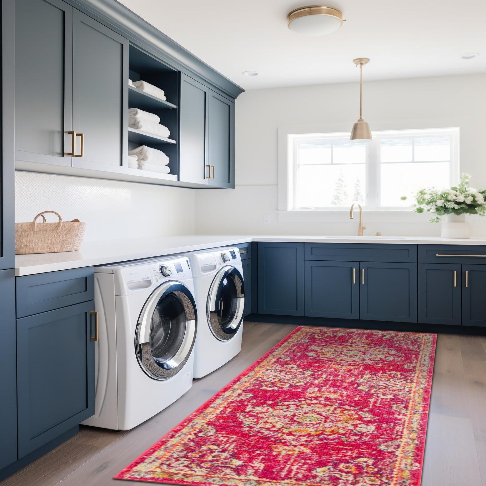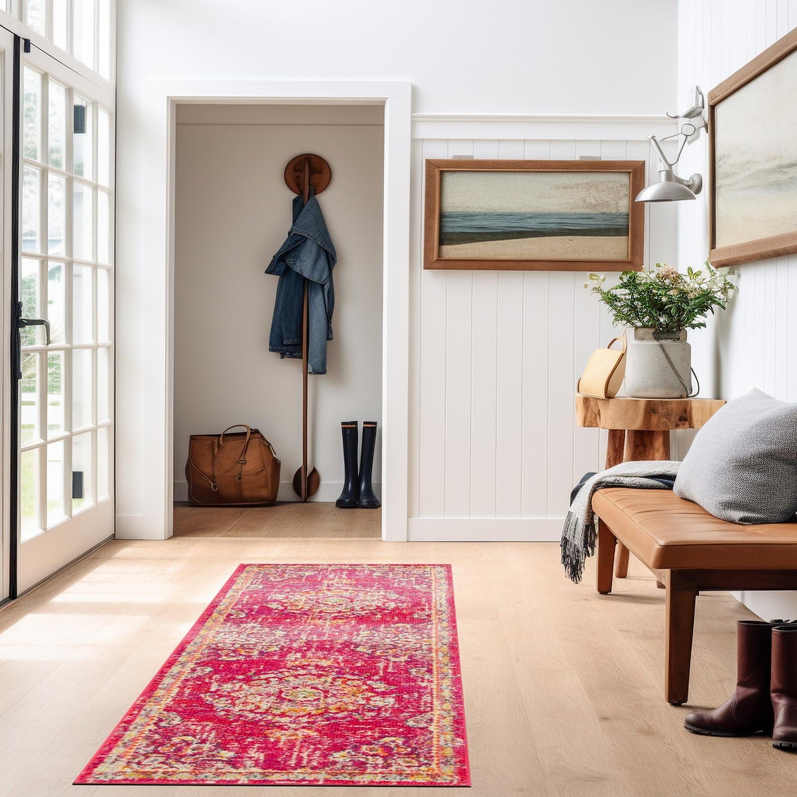 Primary color is Magenta. Colors in this rug include: Magenta, Beige, Gold, Gray, Ivory, Orange, Pink.