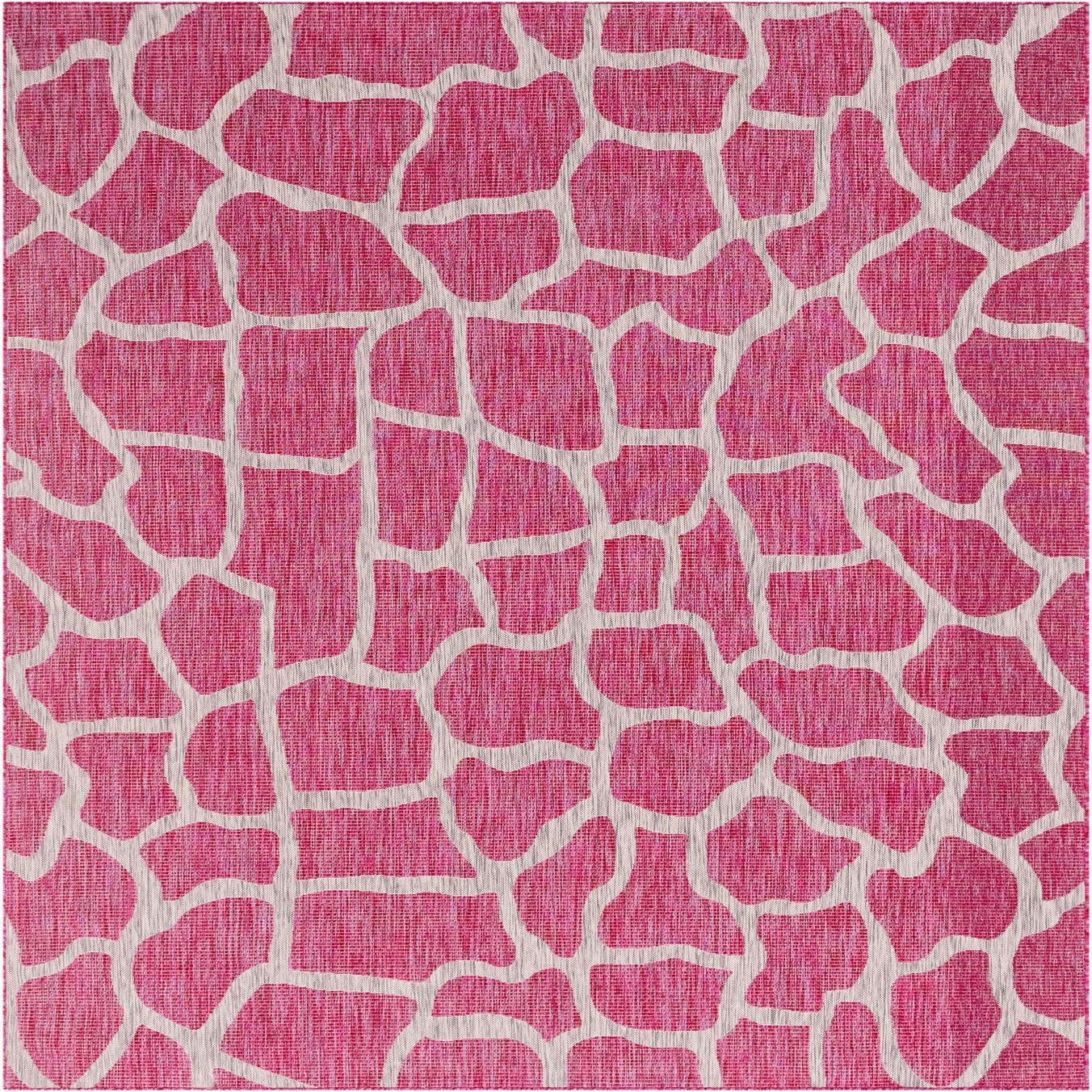 A 6x9 rectangular pink and white rug with an eclectic, modern giraffe-like pattern, suitable for indoor/outdoor use.