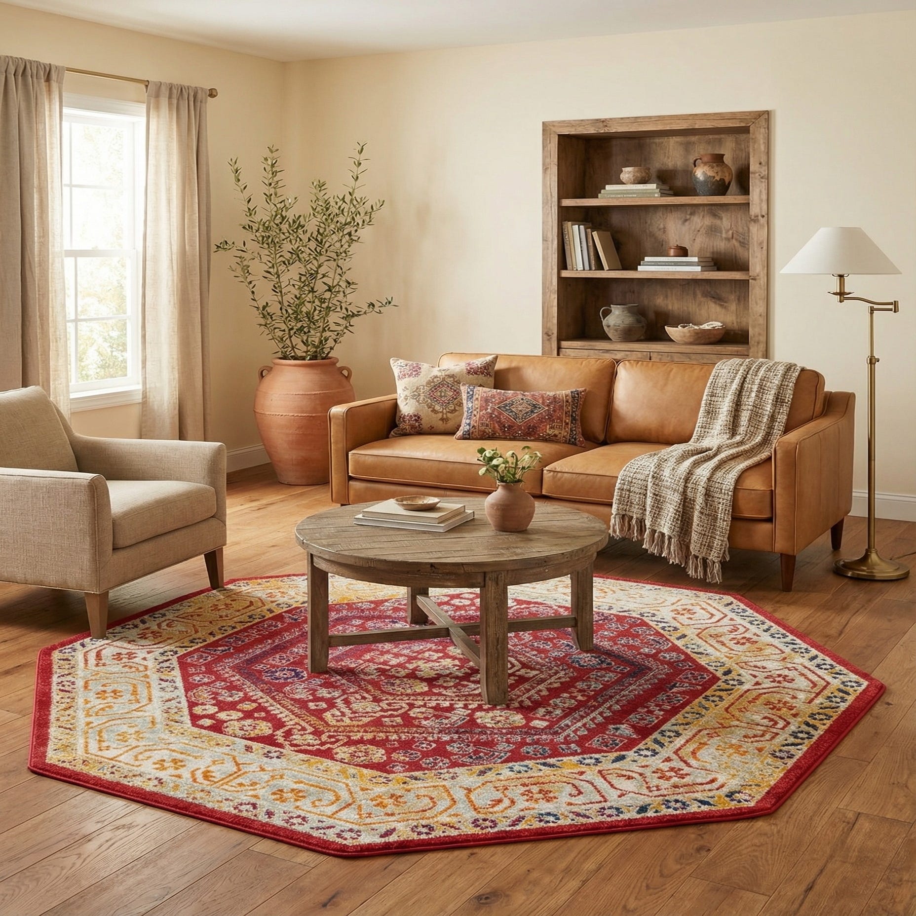 The octagonal shape and lively palette make this piece a strong focal point for a foyer or seating nook, and it also works well beneath a small round or pedestal dining table. Pair it with neutral upholstery to let the colors pop, or complement navy and mustard accents for a coordinated look. Its mix of traditional motifs and vibrant tones suits transitional, global-inspired, and eclectic interiors where color and pattern are welcome.