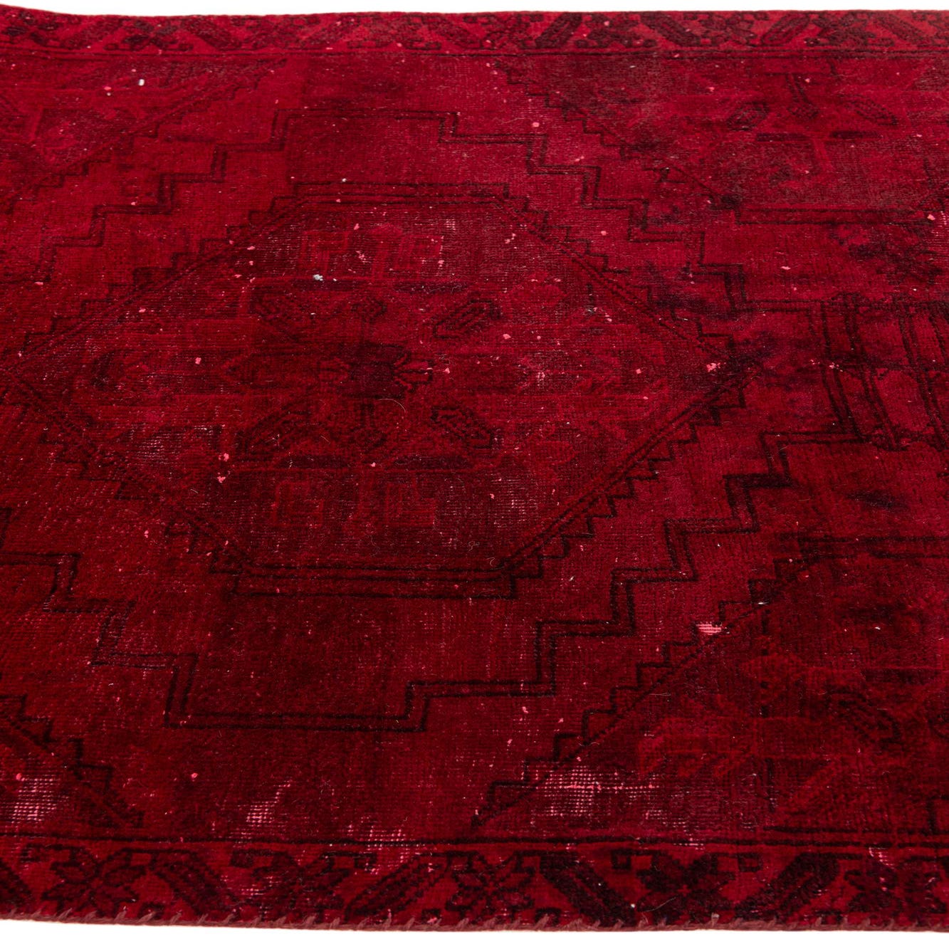 A 7 ft runner rug in deep red with faded black Persian-style patterns, showcasing a vintage, distressed look.