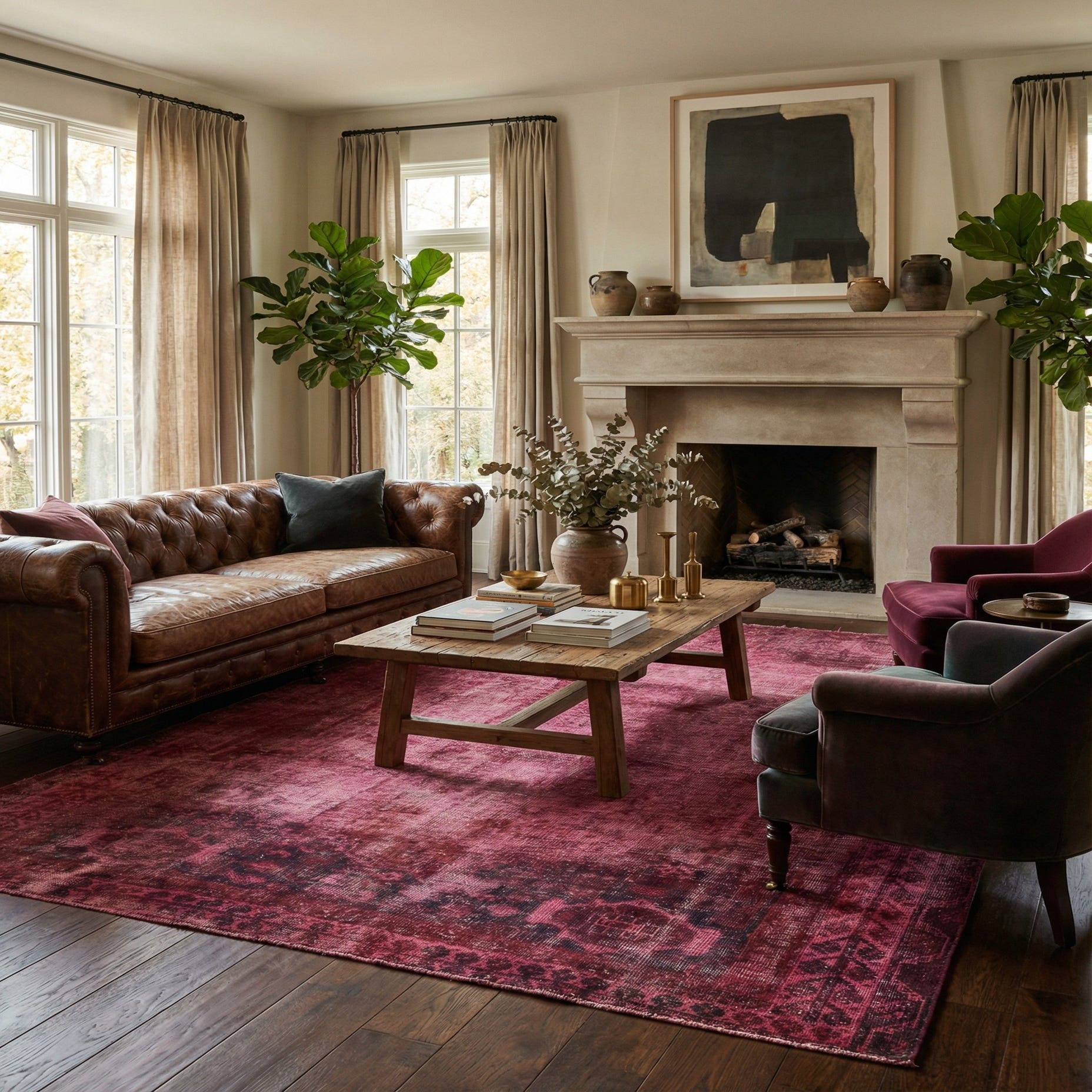 The rug's wool composition ensures a soft, tactile experience underfoot and contributes to its durable quality, making it suitable for areas with high foot traffic. The sophisticated color palette and distressed pattern of the rug allow it to seamlessly integrate into various interior design schemes. It would complement spaces that strive for a balance between the classic and the modern, such as an elegant living room, a stylish home office, or a chic dining area. Additionally, this piece would serve as an artistic focal point in a minimalist setting, where its bold colors can stand out against a neutral palette, or it could harmoniously blend into a more eclectic surrounding, contributing to a rich, layered aesthetic.
