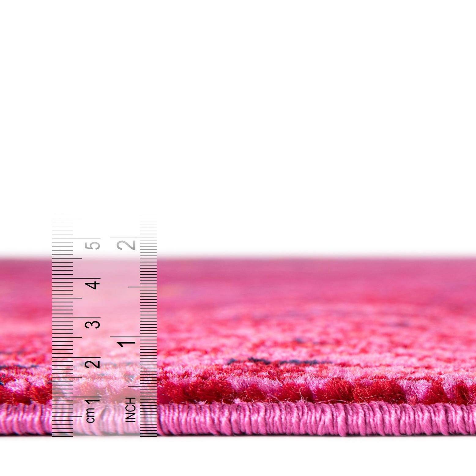 A rich magenta ground anchors a distressed floral-medallion pattern that balances traditional ornament with a modern color story. Layers of puce, orange, purple, red, pink and light blue are woven into the design, while deeper threads of brown and black add contrast and definition. The surface has a low, closely sheared pile that feels smooth underfoot; machine-made from 100% polypropylene for a consistent, tightly woven finish with a slightly plush hand.