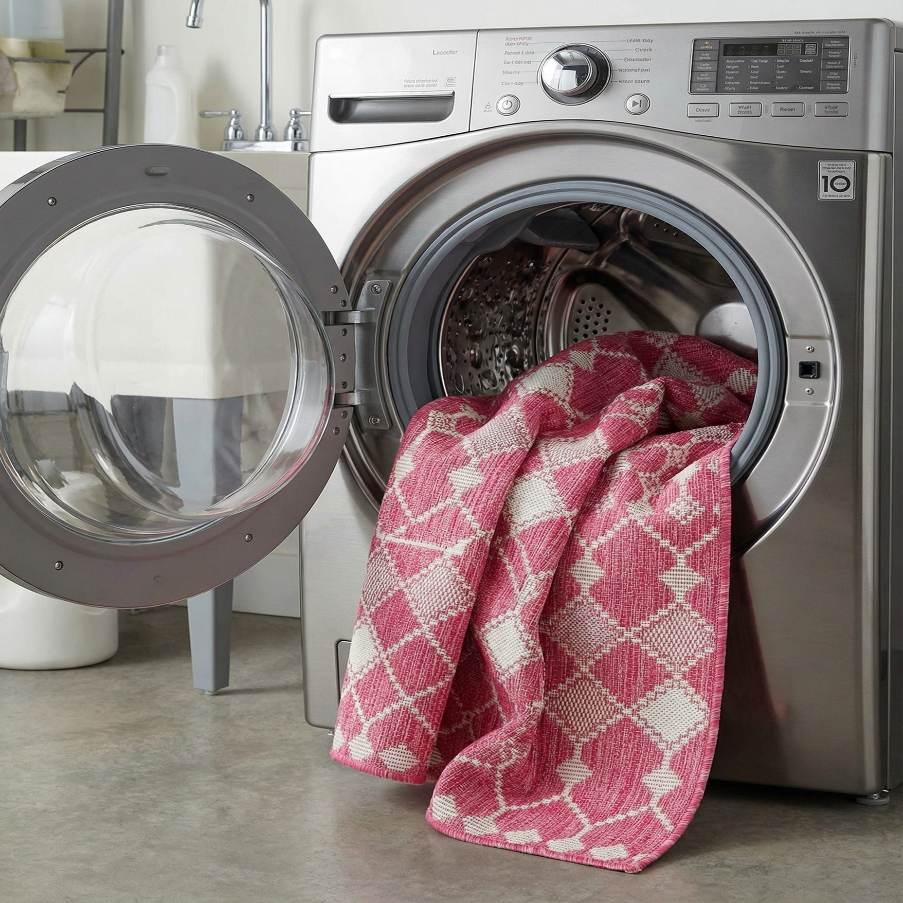 This runner works well in a bright hallway, a covered porch, or along a kitchen aisle where color and pattern lift the space without adding bulk. Pair it with white or natural wicker and navy cushions for a coastal-inspired outdoor seating area, or use it to bring a contemporary pop of color to a neutral entry or mudroom. The graphic ivory lattice helps tie in crisp linens and simple, modern furniture, while the magenta background makes the piece a clear focal point in both indoor and sheltered outdoor settings.