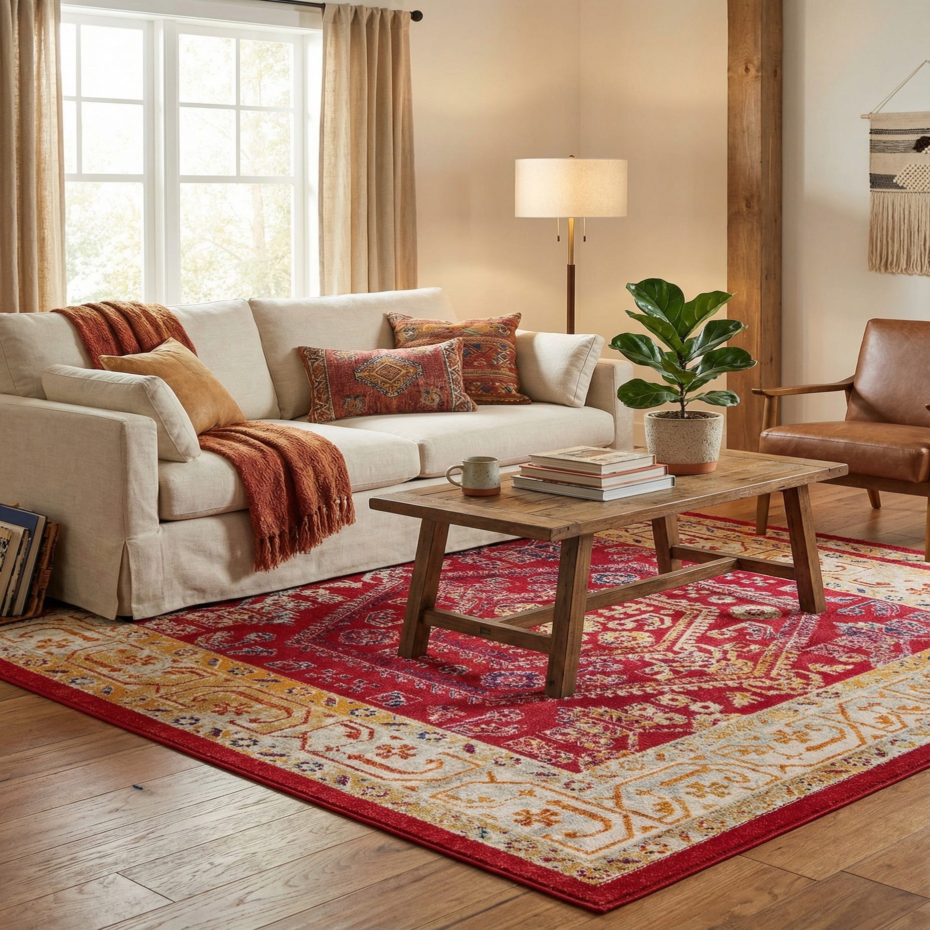 Machine made from 100% polypropylene, the rug has a low, soft pile that yields gently underfoot and offers a subtle velvety hand and light sheen. Place it beneath a coffee table to anchor a living area, layer it under a dining table for a vivid focal point, or use it to warm a bedroom with bold color. It works well with natural wood furniture, brass or matte-metal accents and neutral upholstery, and complements interiors from eclectic and bohemian to transitional or globally inspired schemes.
