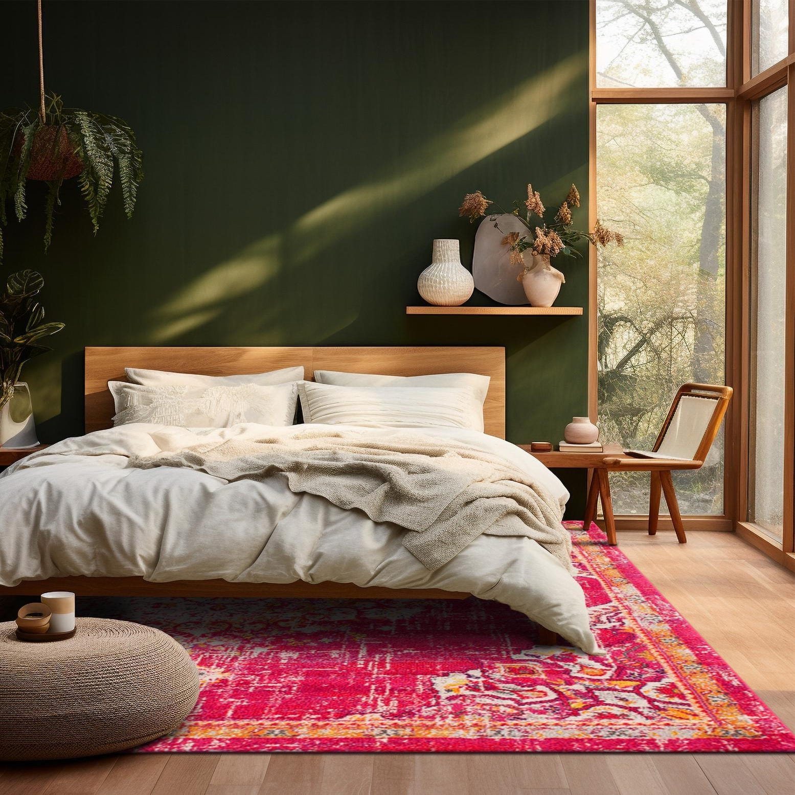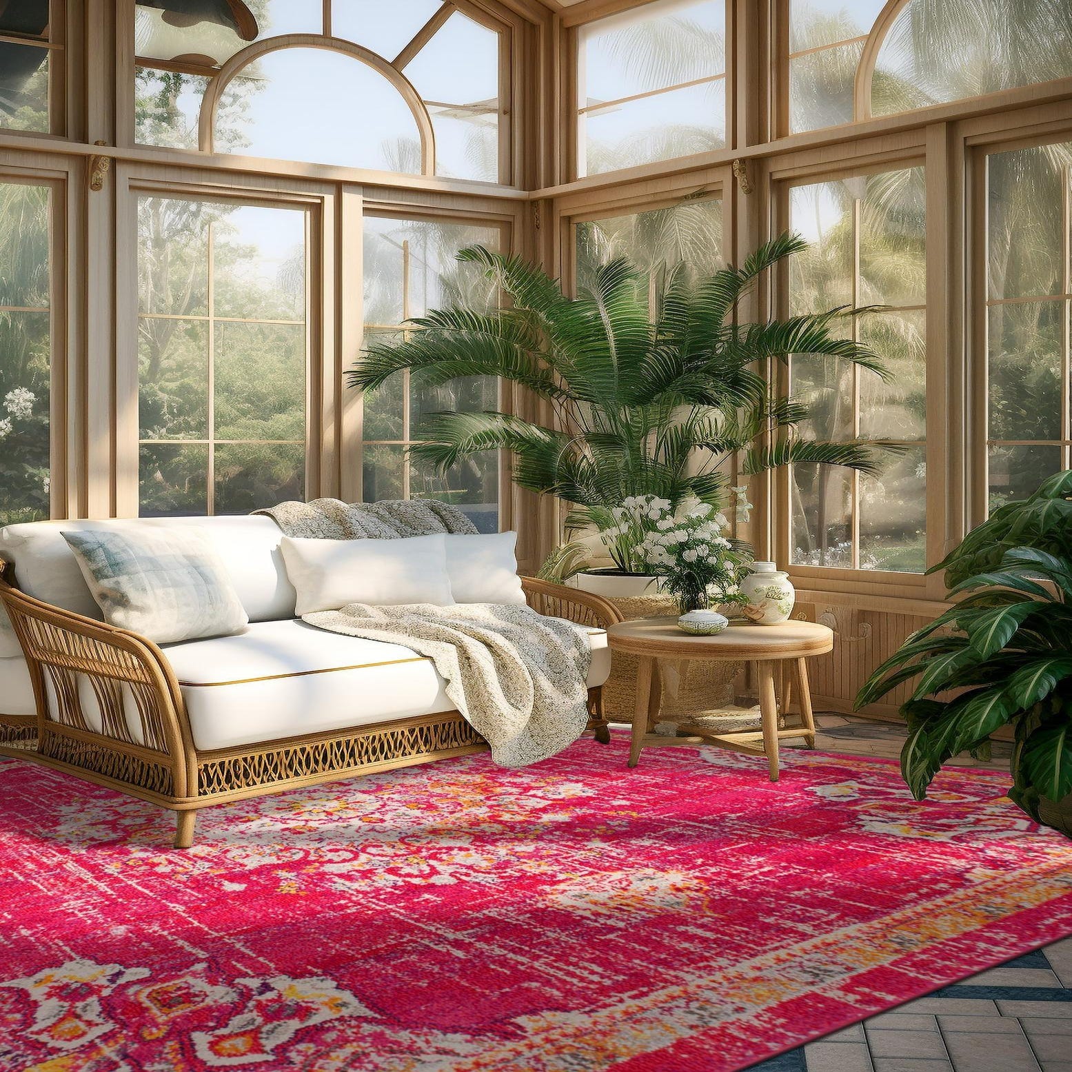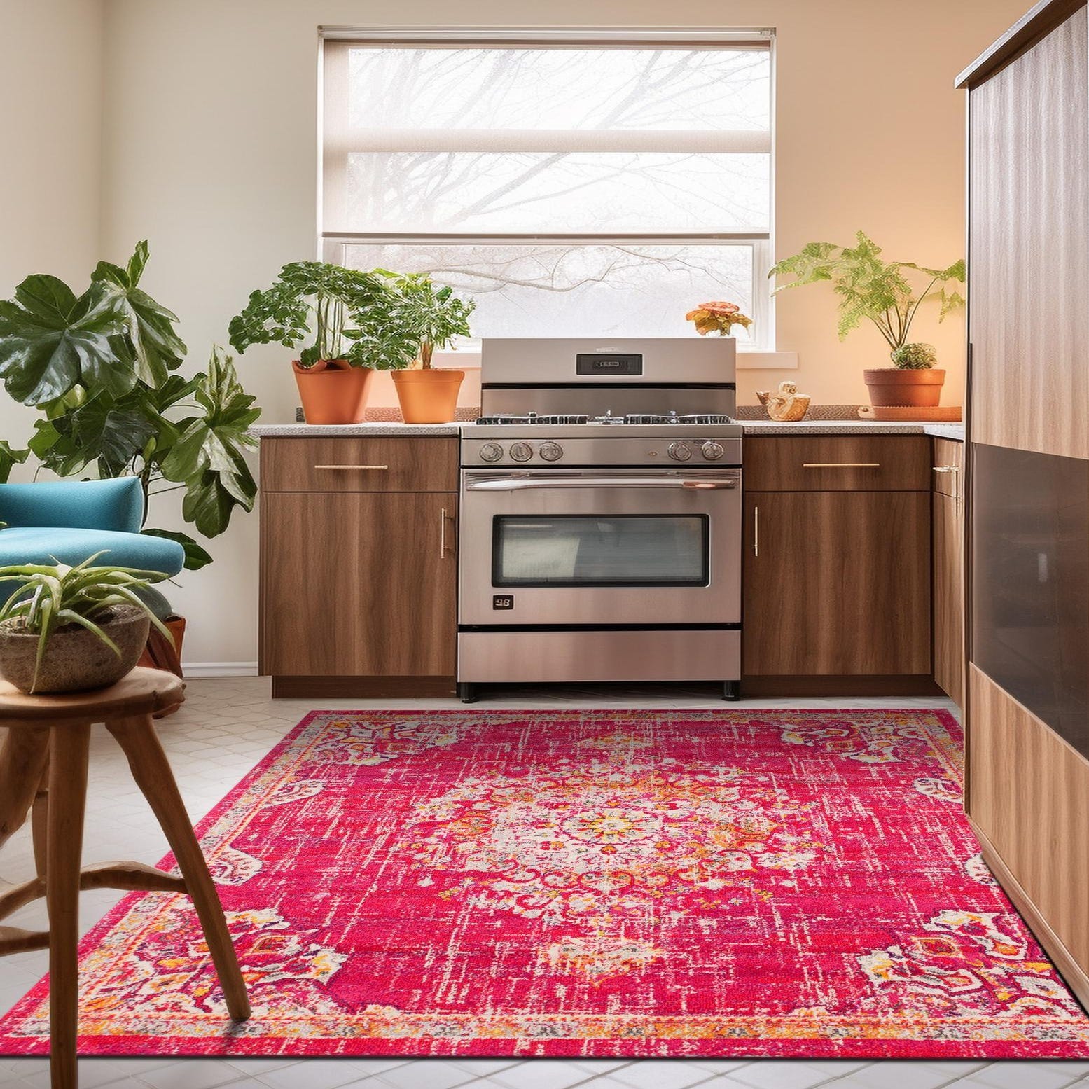 This Madeline Collection rug would fit seamlessly into a variety of interior design scenarios, particularly those aiming for a bold statement piece. Its square shape and size make it an ideal centerpiece for a dining area, living room, or open-plan space. The rug's striking color scheme and pattern would complement minimalist spaces that use neutral colors by adding a pop of color and visual interest. Similarly, it would resonate well in eclectic or bohemian decor, aligning with a mix of colors and textures often found in such spaces.