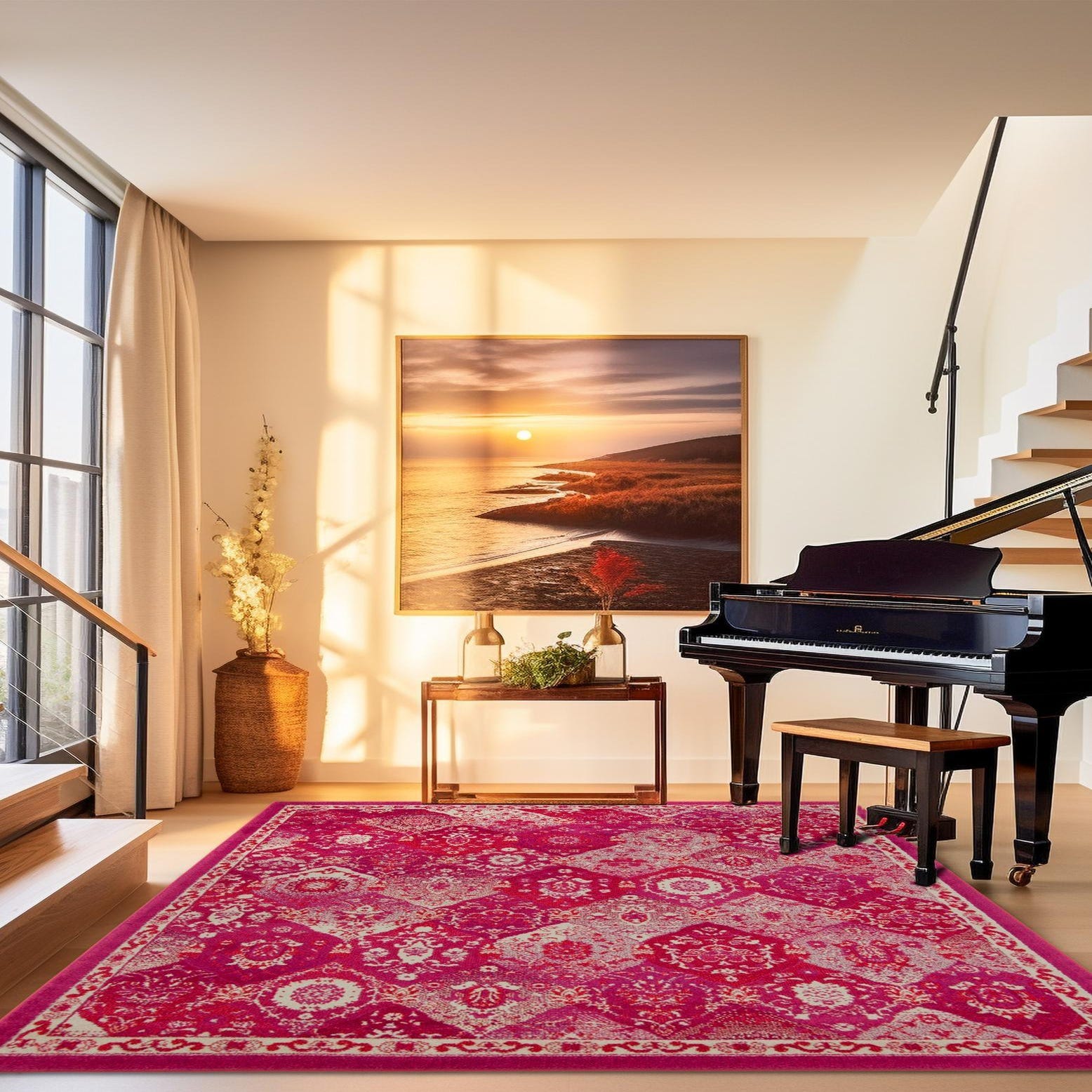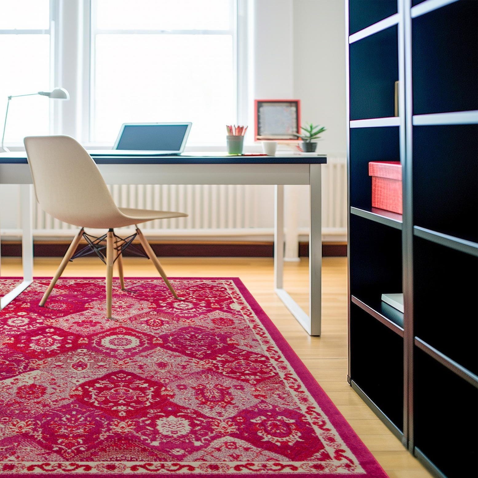 Primary color is Magenta. Colors in this rug include: Magenta, Ivory, Olive, Purple, Red, Violet.