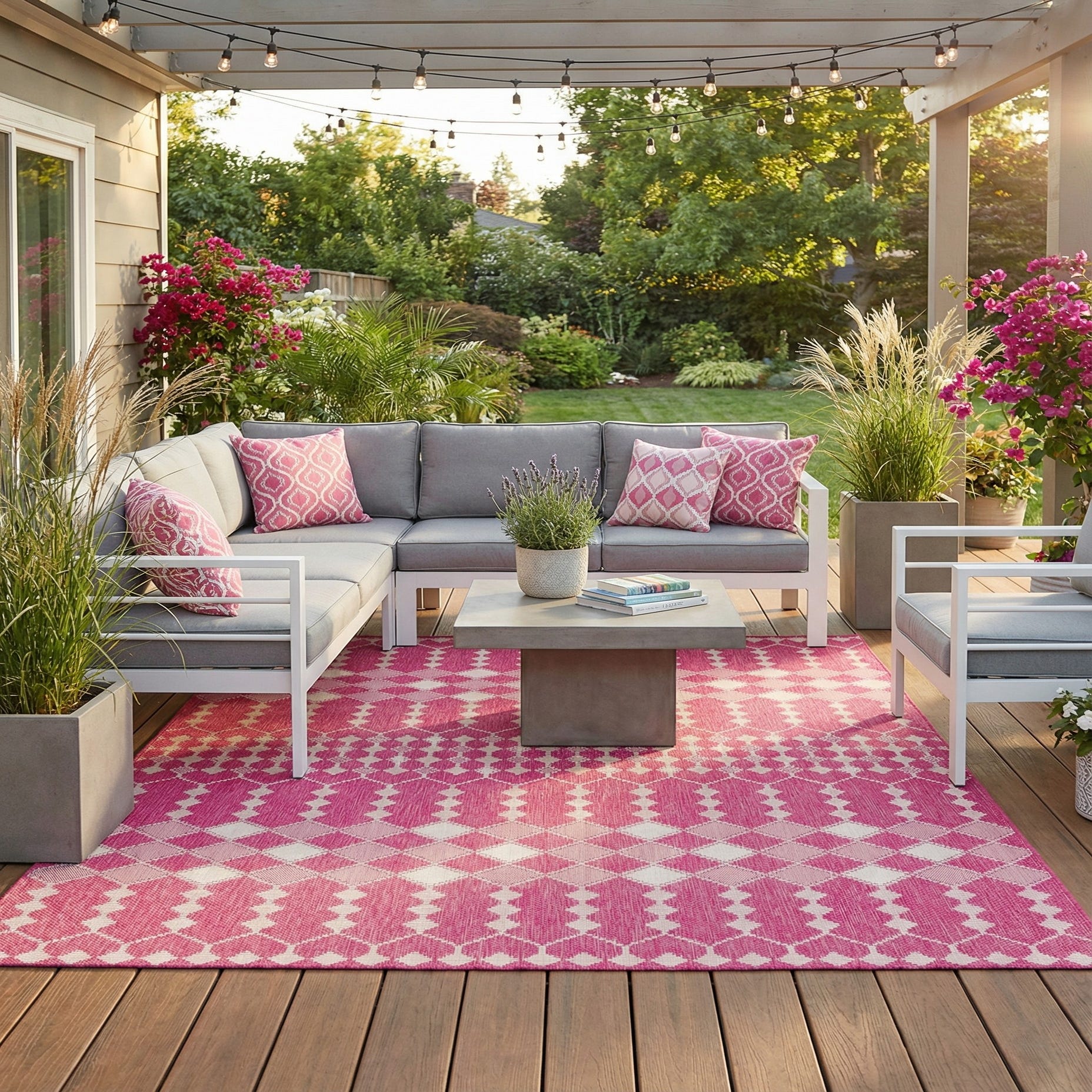 The striking color palette and pattern of the Outdoor Lattice rug make it ideal for outdoor living spaces, such as patios or decks, to complement nature’s colors and bring a pop of personality. It would also work equally well in indoor environments, such as a sunroom or casual living area, where its durable nature withstands daily use. The magenta and ivory hues would pair beautifully with neutrals and earth tones, as well as metallic or wooden outdoor furniture, providing a chic and cohesive look.