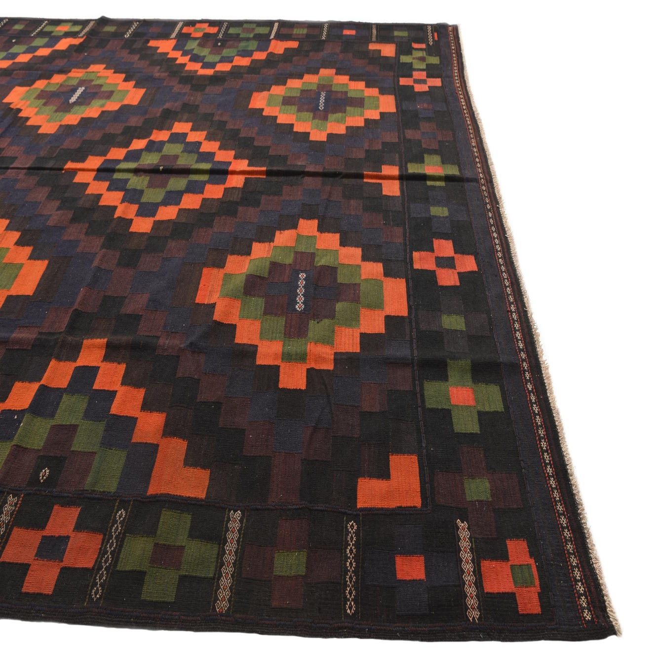 A large 10x16 rectangular Kilim Afghan rug with a tribal geometric pattern in shades of red, orange, and green on a dark background.